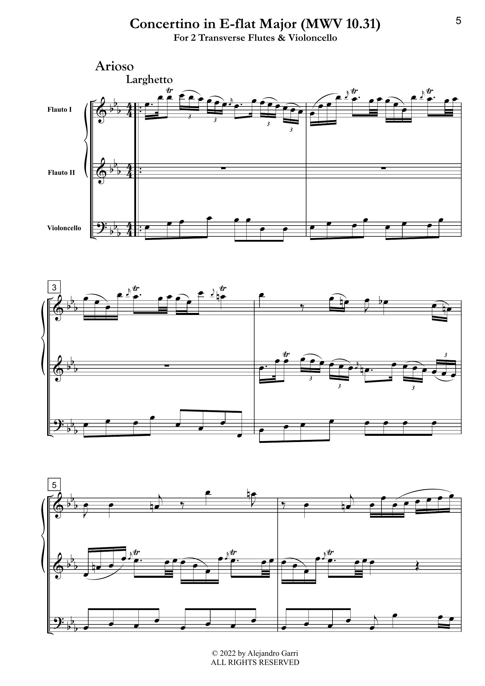 Molter, Johann Melchior (1696 – 1765) Concertino in E-flat Major (MWV 10.31), for 2 Transverse Flutes & Violoncello (full score & 3 parts)