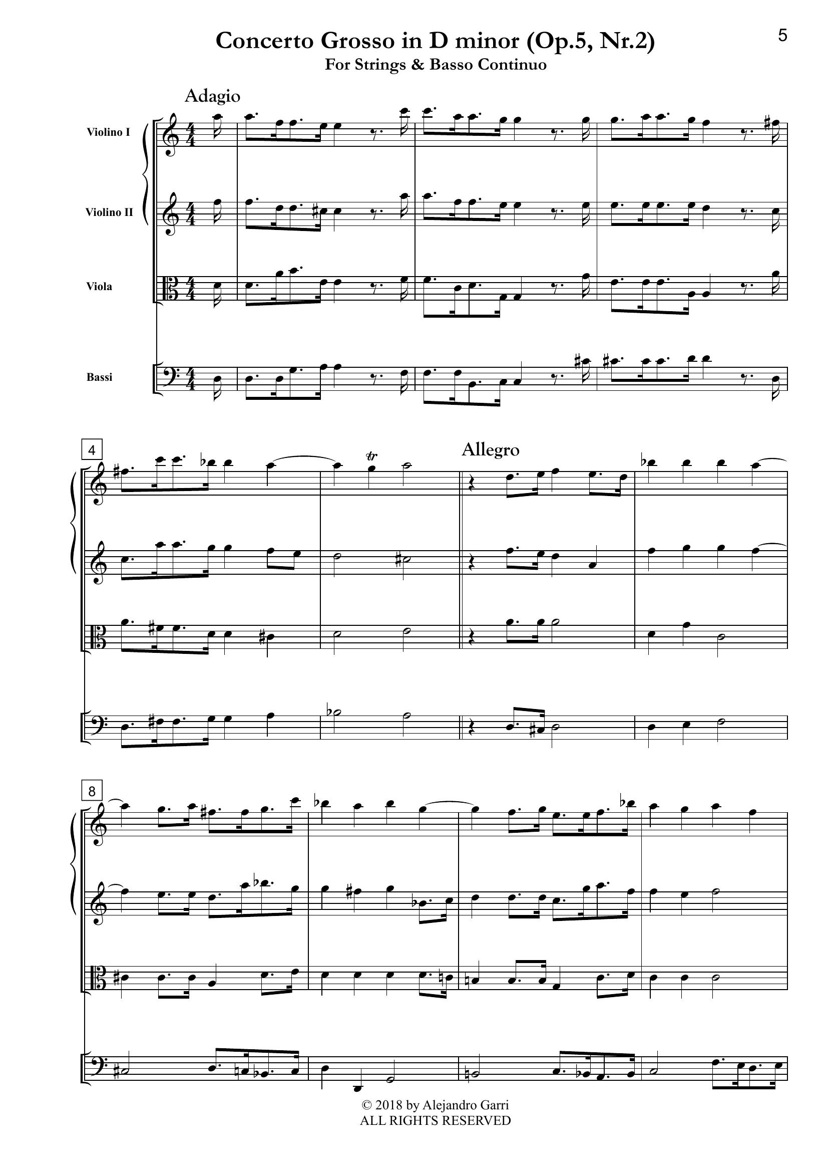 Torelli, Giuseppe (1658 – 1709) Concerto Grosso in D minor (Op.5, Nr.2), for Strings & Basso Continuo (full score & 4 parts)