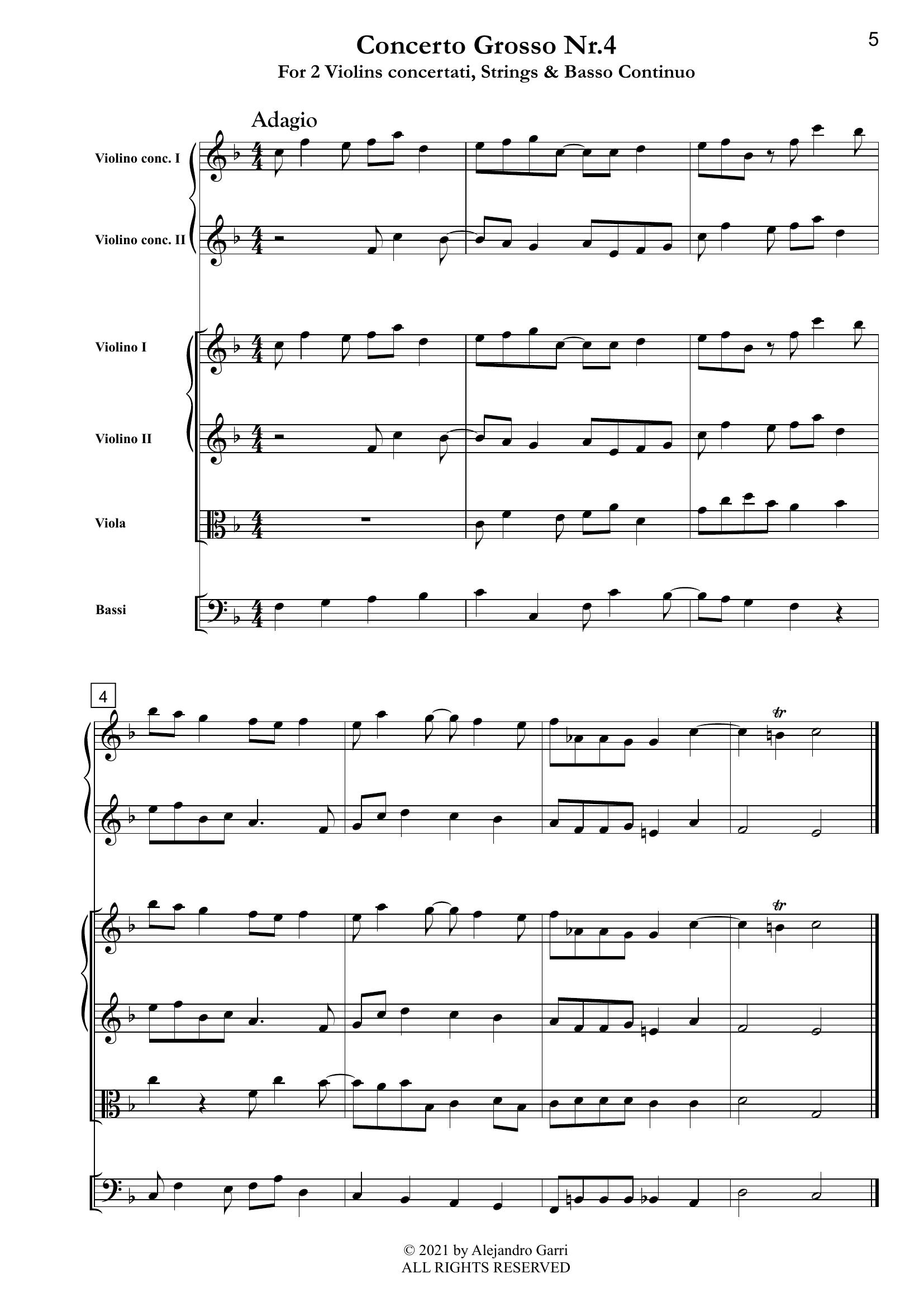 Pepusch, Johann Christoph (1667 – 1752) Concerto Grosso Nr.4, for 2 Violins concertati, Strings & Basso Continuo (full score & 6 parts)