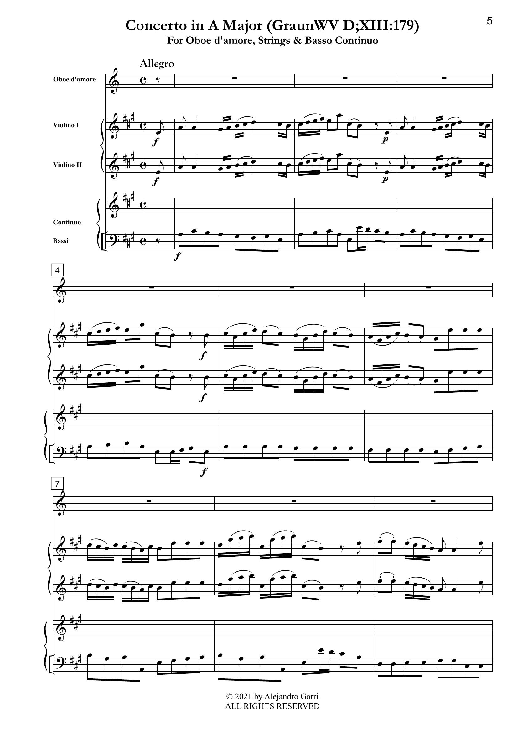 Graun, Carl Heinrich (ca.1703 – 1759) Concerto in A Major (GraunWV D:XIII:179) for Oboe d’amore, 2 Violins & Basso Continuo (full score 4 parts)