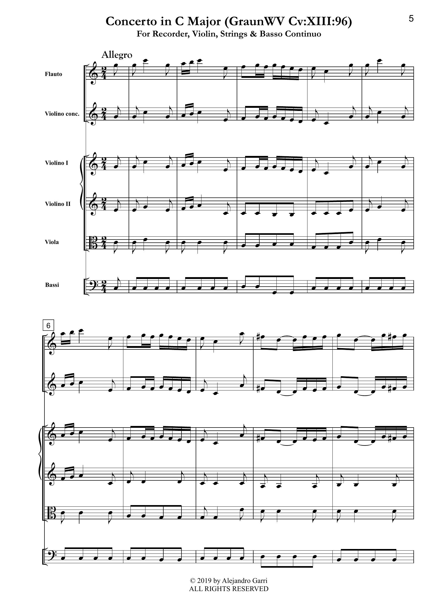 Graun, Johann Gottlieb (1702/03 – 1771) Concerto in C Major(GraunWV Cv:XIII:96), for Recorder, Violin, Strings & Basso Continuo (full score & 6 parts)