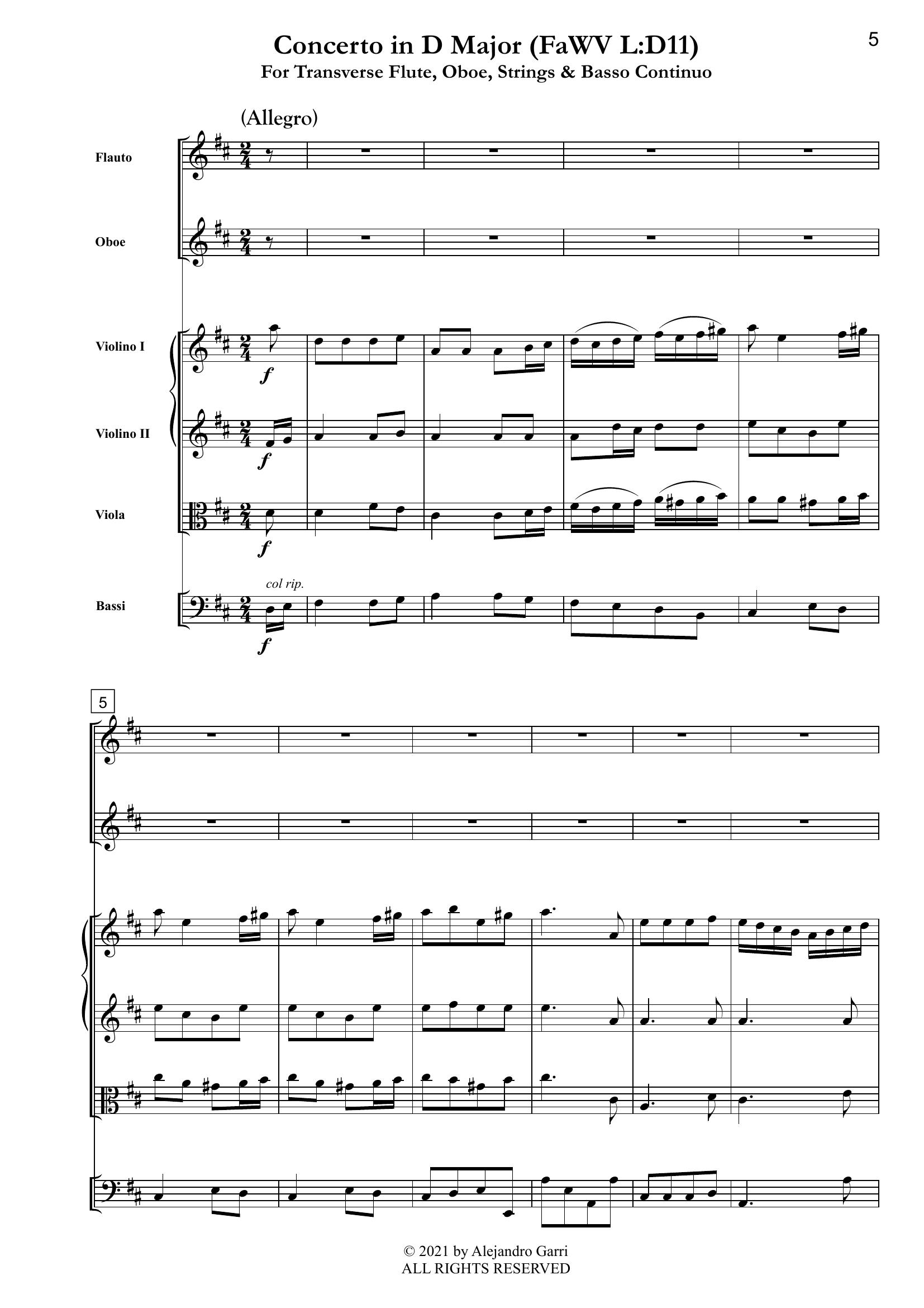 Fasch, Johann Fr. (1688-1758) Concerto in D Major (FaWV L:D11), for Transverse Flute, Oboe, Strings & Basso Continuo (full score & 6 parts)