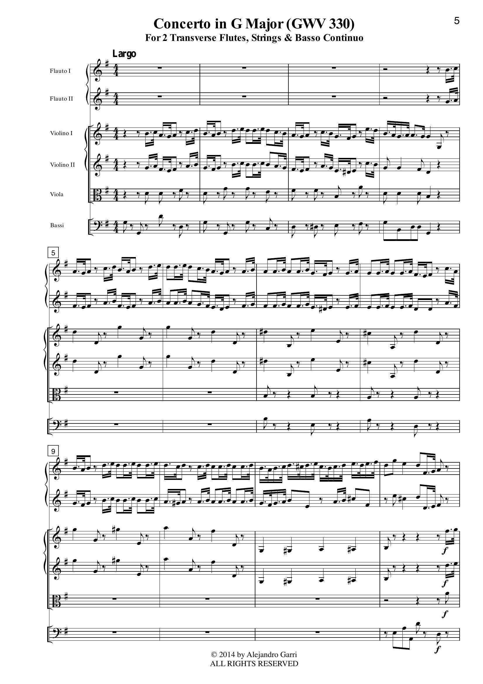 Graupner, Christoph (1683 – 1760) Concerto in G Major (GWV 330), for 2 Transverse Flutes, Strings & Basso Continuo (full score & 6 parts)