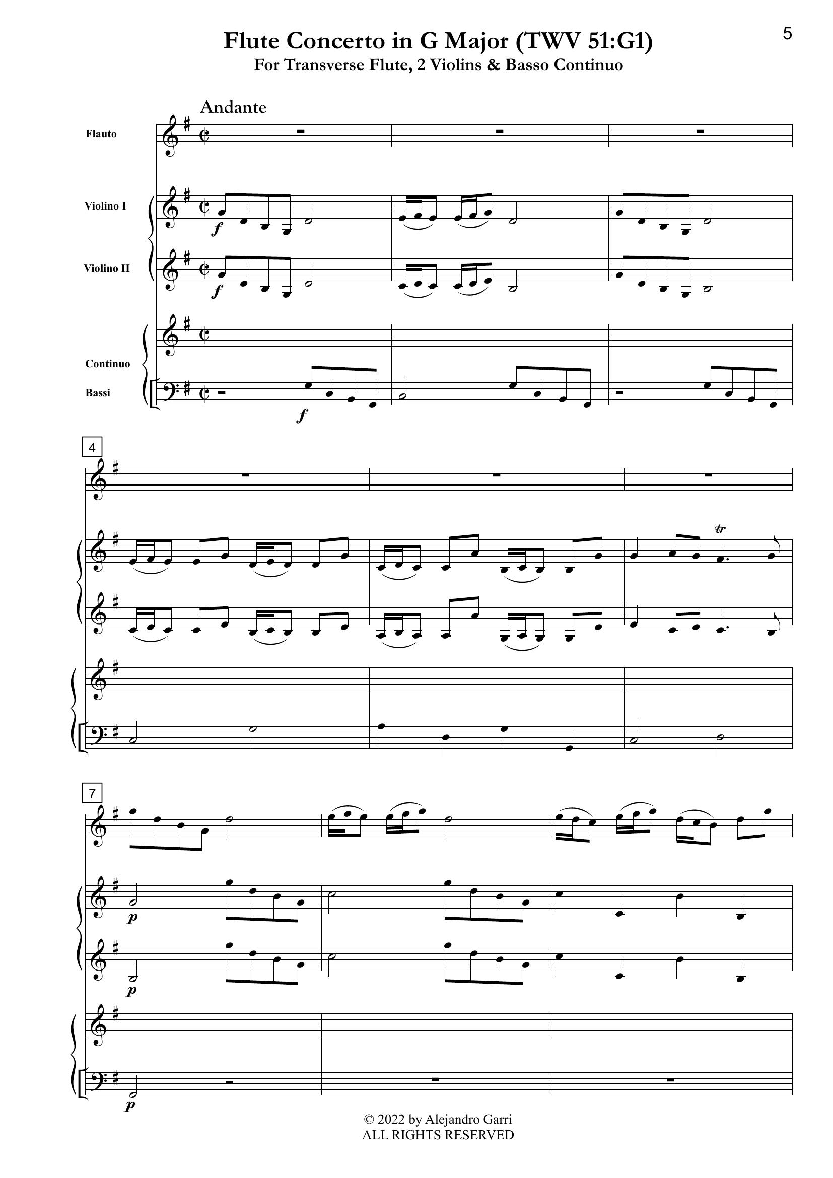 Telemann, Georg Ph. (1681 – 1767) Concerto in G Major (TWV 51:G1), for Transverse Flute, 2 Violins & Basso Continuo (full score & 4 parts)