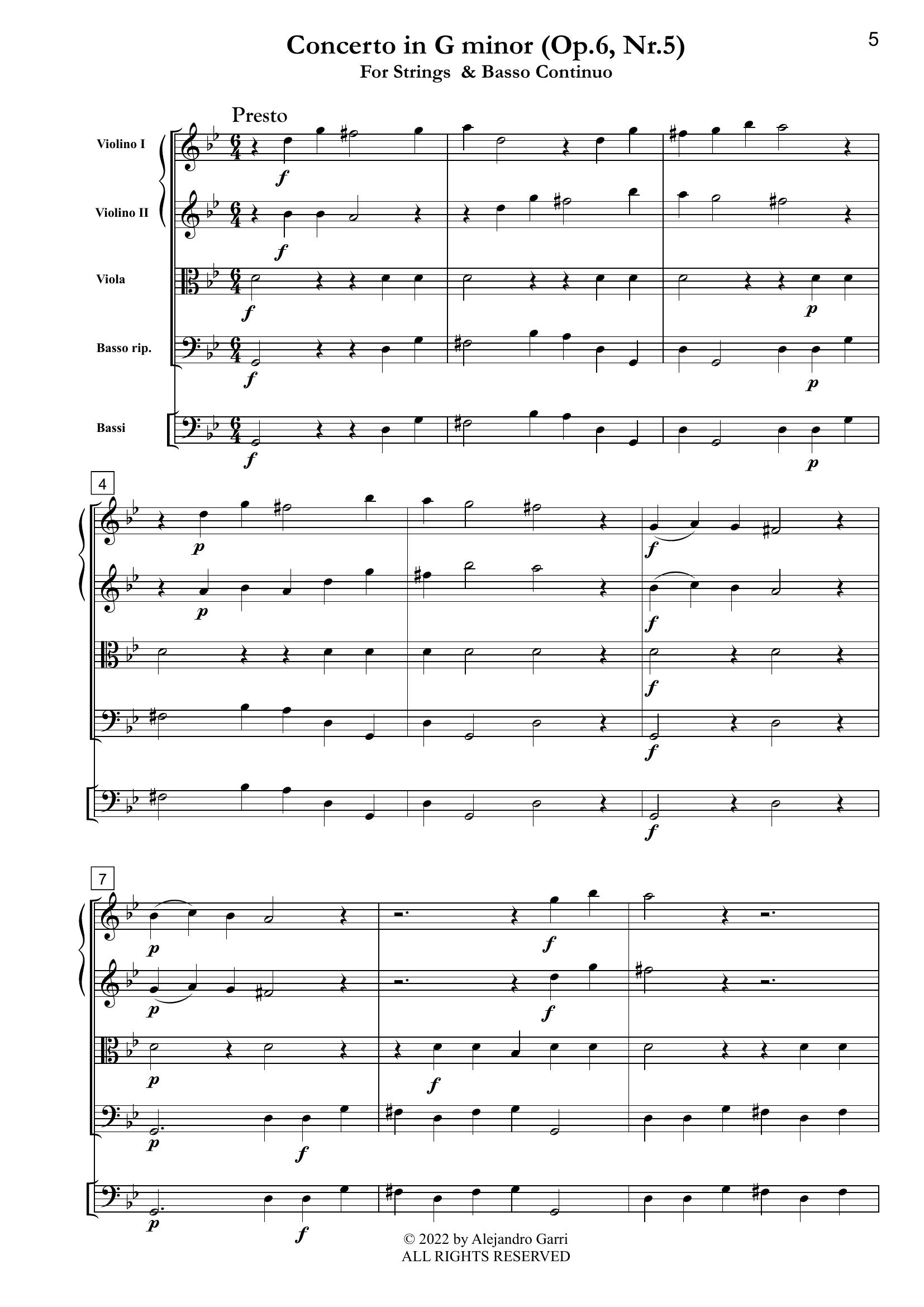 Torelli, Giuseppe (1658 – 1709) Concerto in G minor (Op.6, Nr.5), for Strings & Basso Continuo (full score & 5 parts)