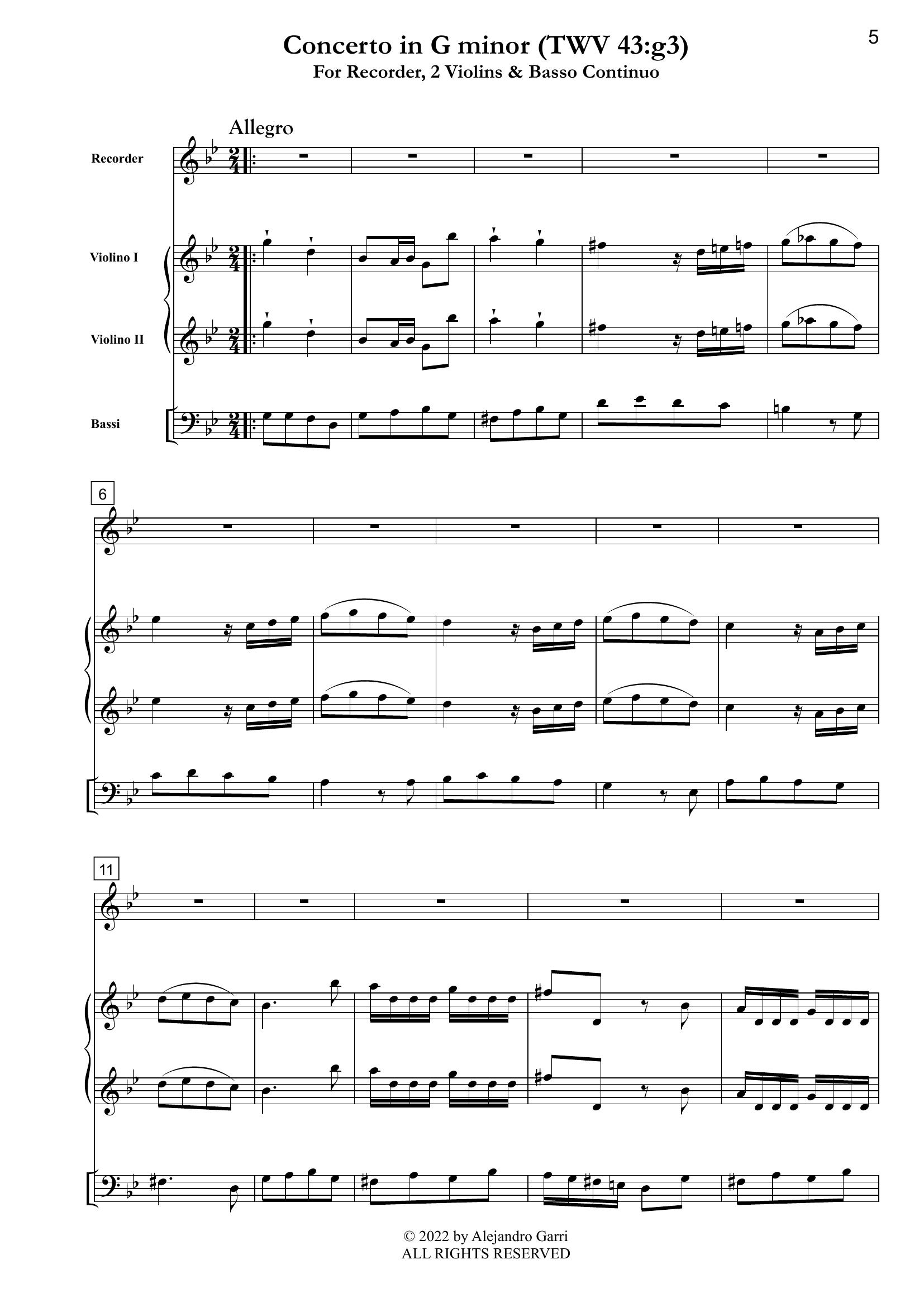 Telemann, Georg Ph. (1681 -1767) Concerto in G minor (TWV 43:g3), for Recorder, 2 Violins & Basso Continuo (full score & 4 parts)