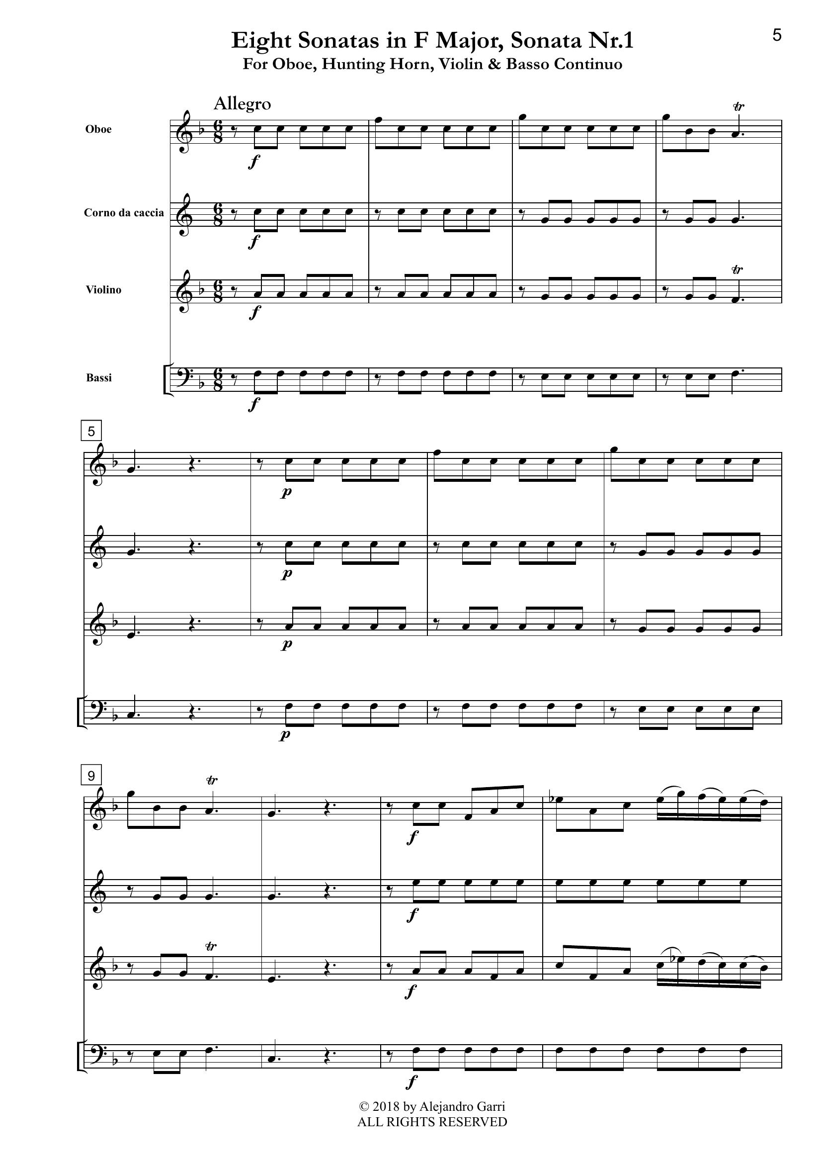 Stölzel, Gottfried Heinrich (1690 – 1749) Eight Sonatas in F Major , Sonata Nr.1, for Oboe, Hunting Horn, Violin & Basso Continuo (full score & 4 parts)