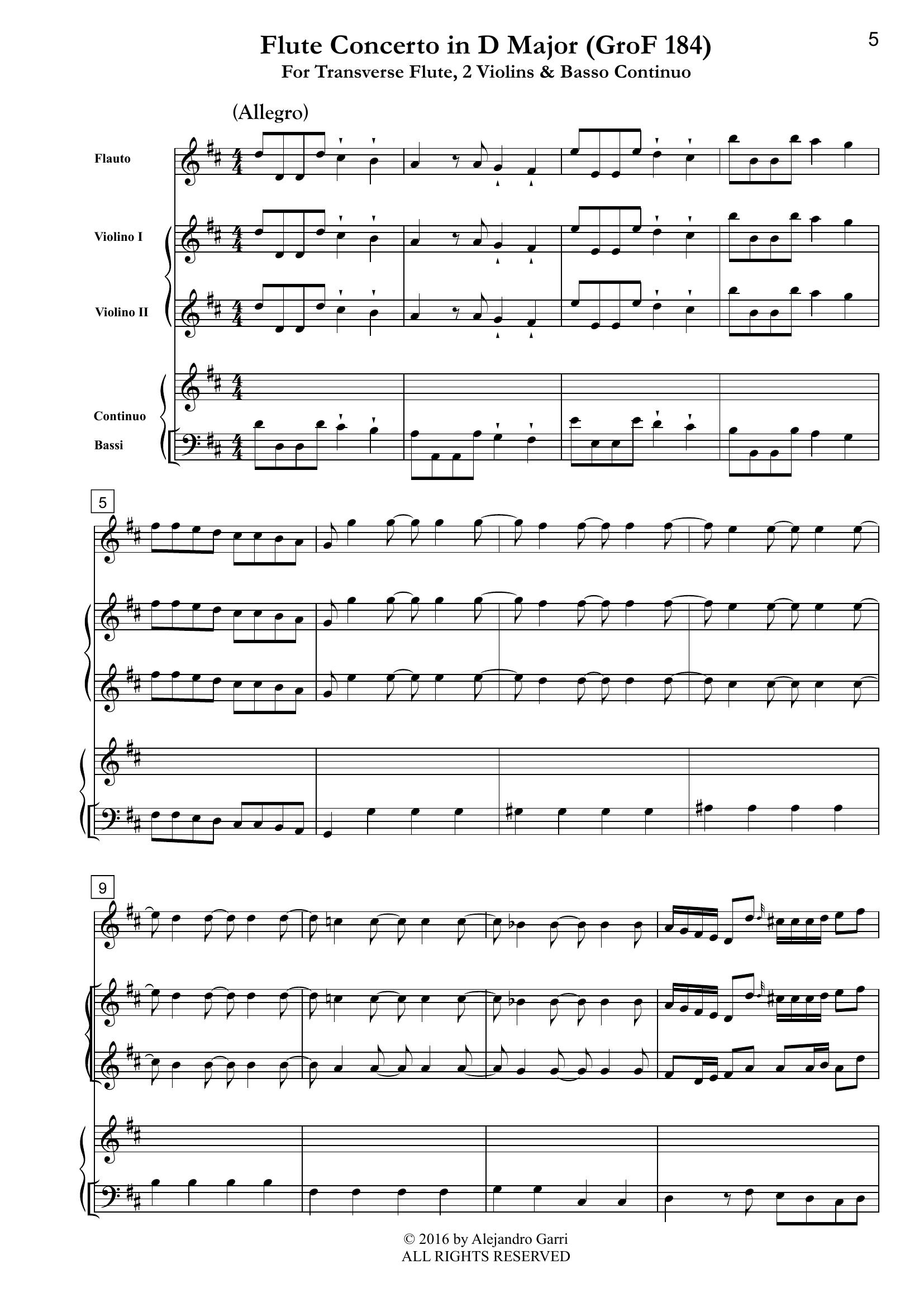 Hasse, Johann A. (1699 – 1783) Flute Concerto in D Major (Op.3, Nr.2), for Flute, 2 Violins & Basso Continuo (full score & 4 parts)