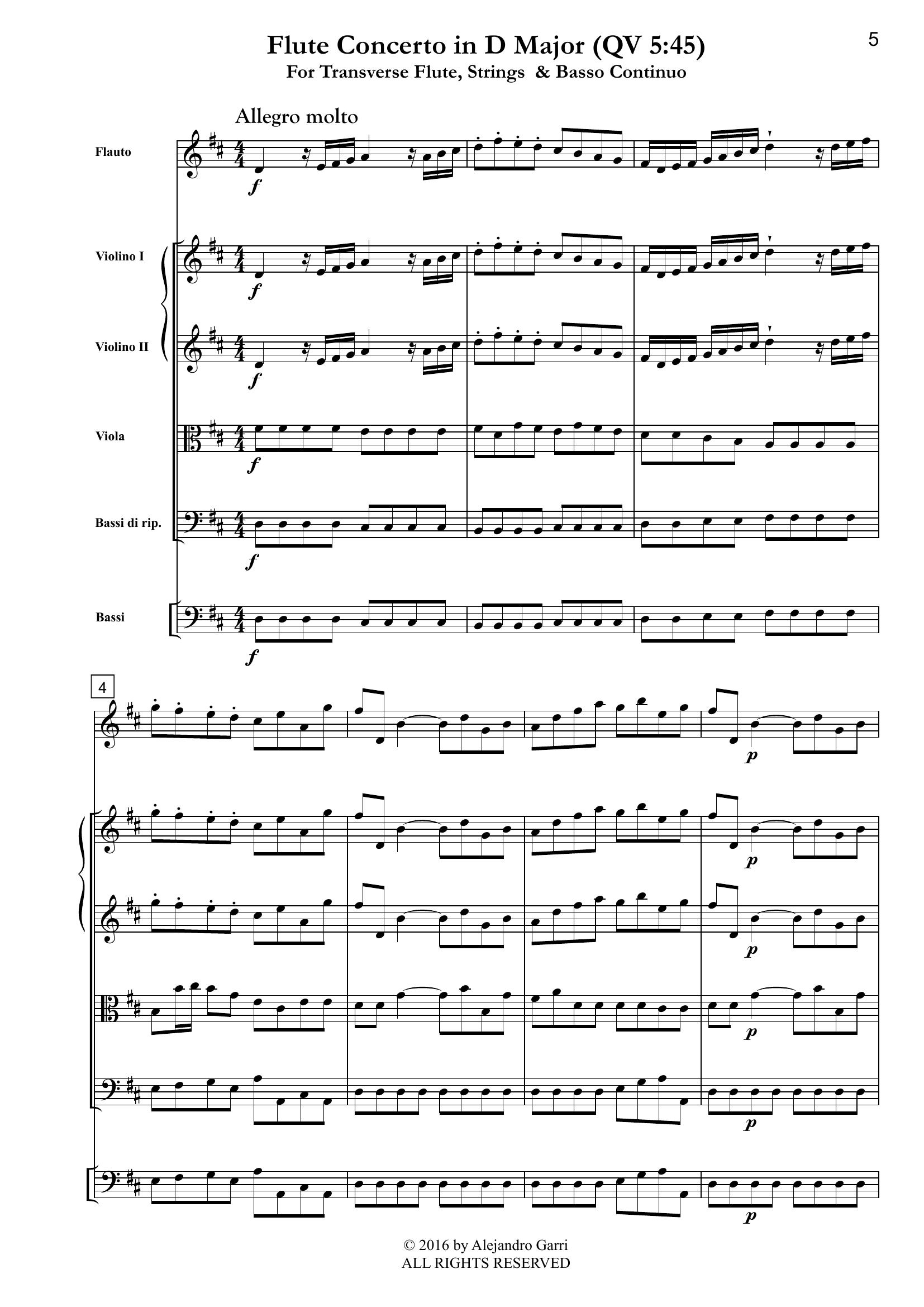 Quantz, Johann Joachim (1697 – 1773) Flute Concerto in D Major (QV 5:45), for Transverse Flute, Strings & Basso Continuo (full score)