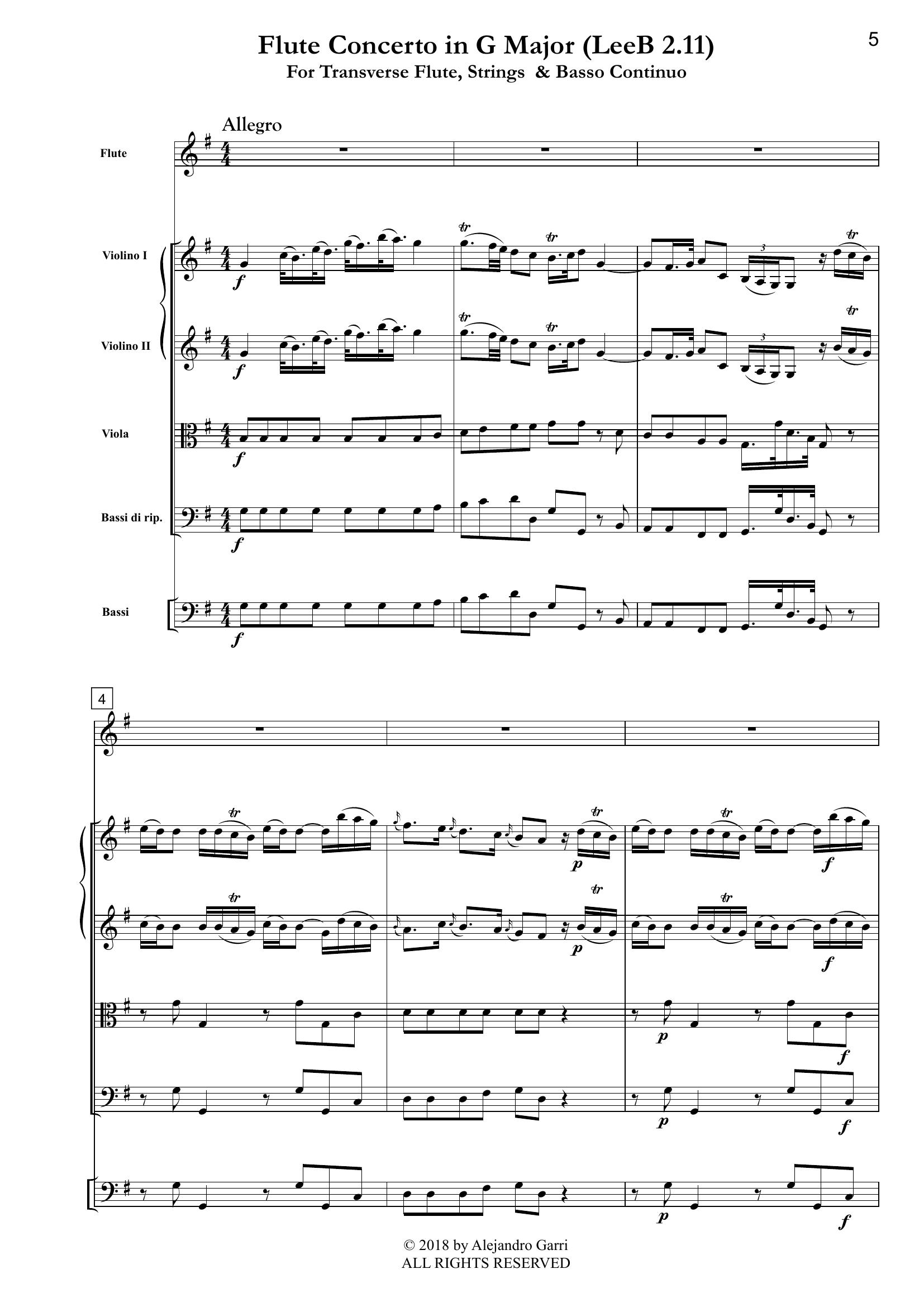 Benda, Franz (1709 -1786) Flute Concerto in G Major (Leeb 2.11), for Transverse Flute, Strings & Basso Continuo (full score)