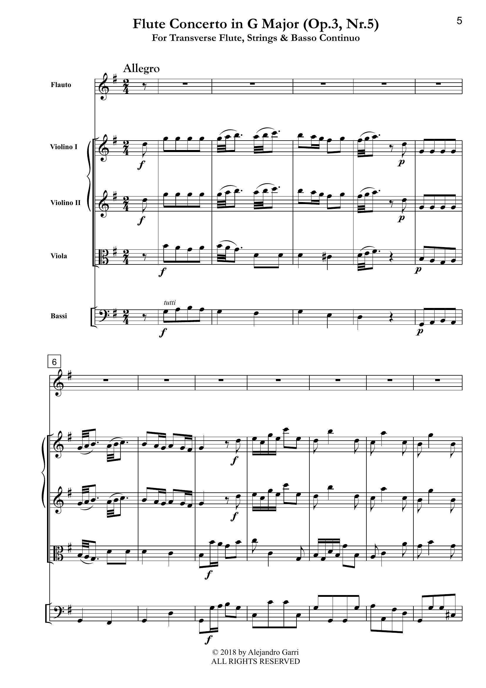 Hasse, Johann A. (1699 – 1783) Flute Concerto in G Major(Op.3, Nr.5), for Transverse Flute, Strings & Basso Continuo (full score & 5 parts)