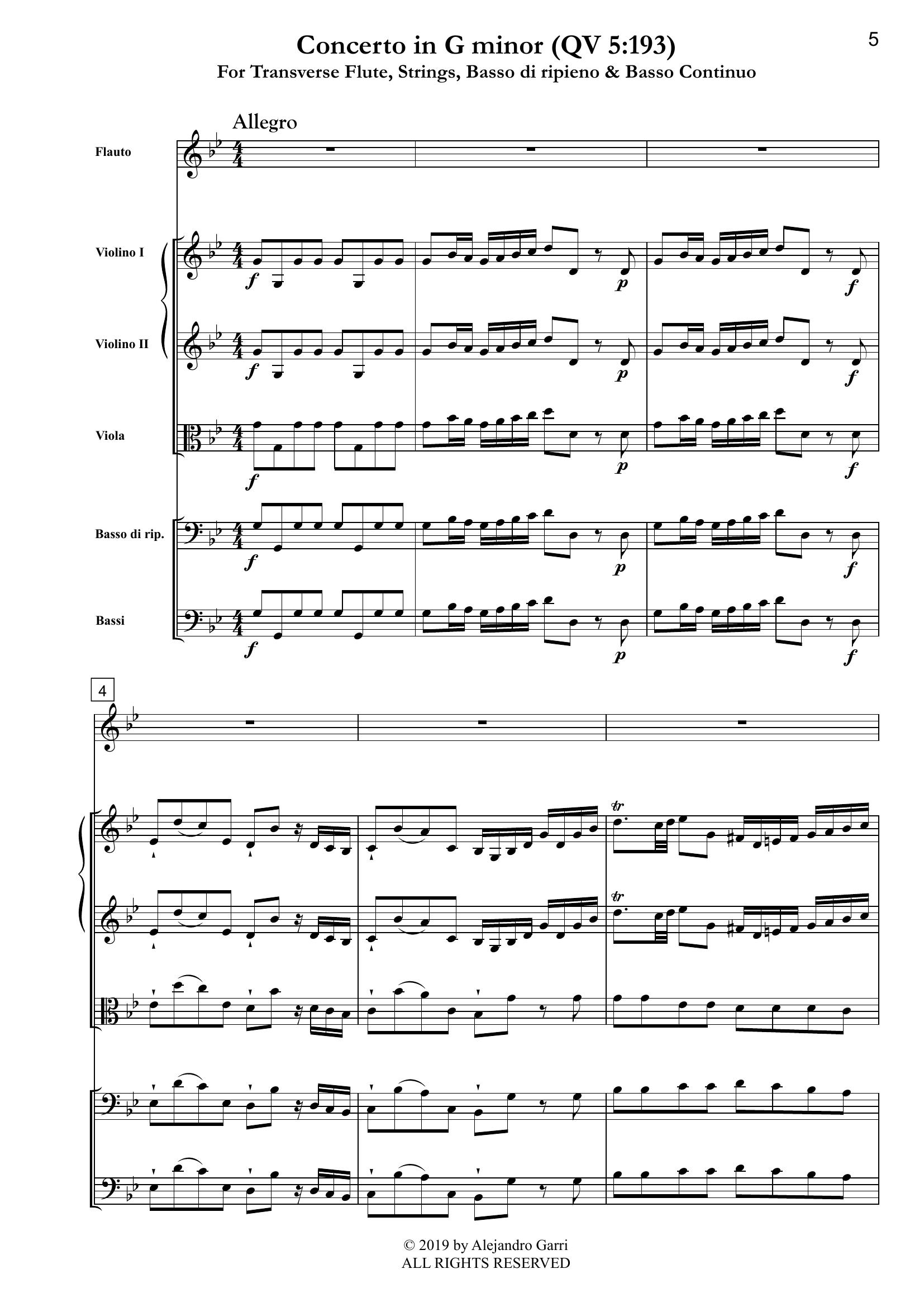 Quantz, Johann Joachim (1697 – 1773) Flute Concerto in G minor (QV 5:193), for Transverse Flute, Strings, Basso di ripieno & Basso Continuo (full score)
