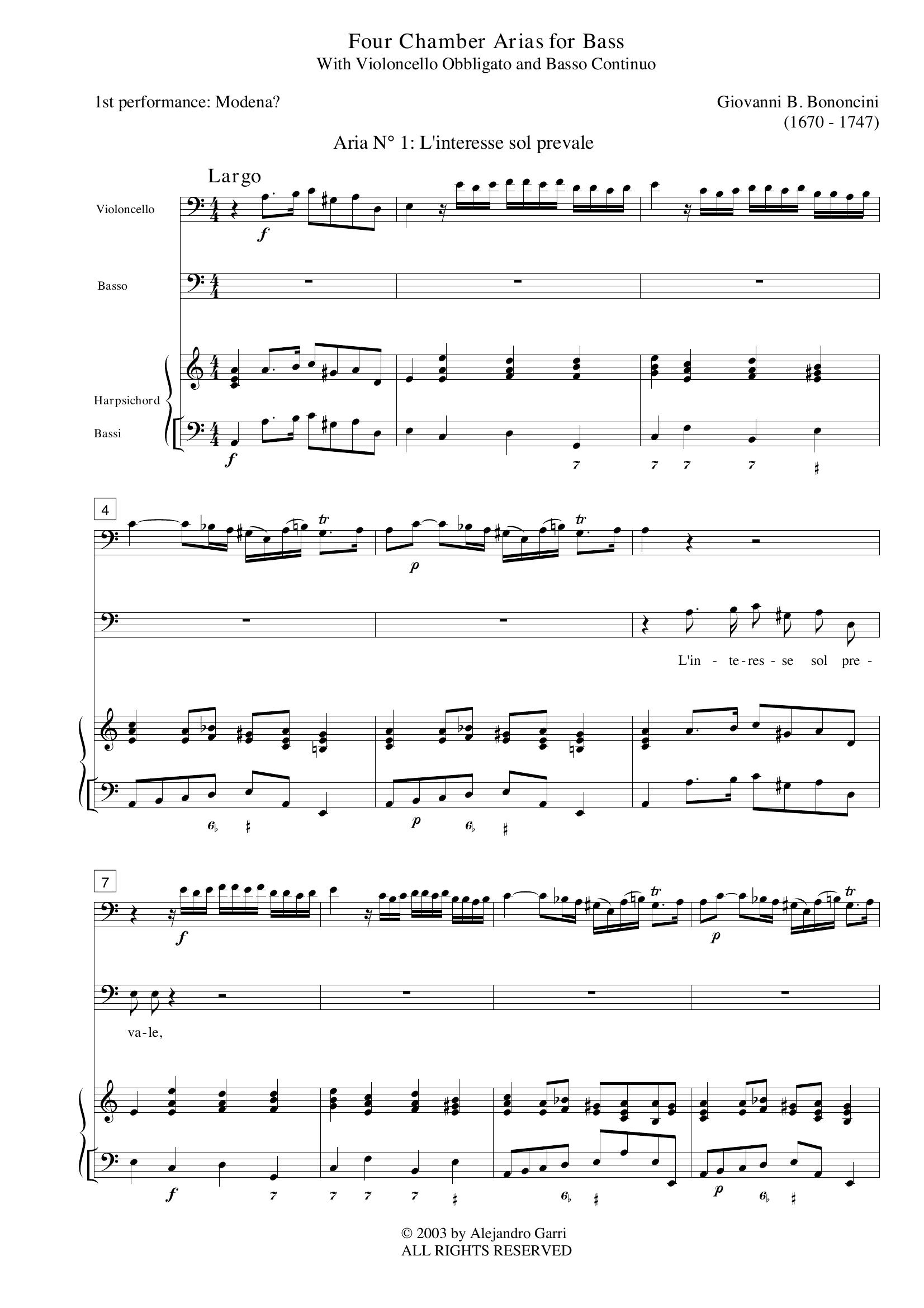 Bononcini, Giovanni B. (1670-1747) Four Chamber Arias, for Bass, Cello Obbligato & Basso Continuo (full score)