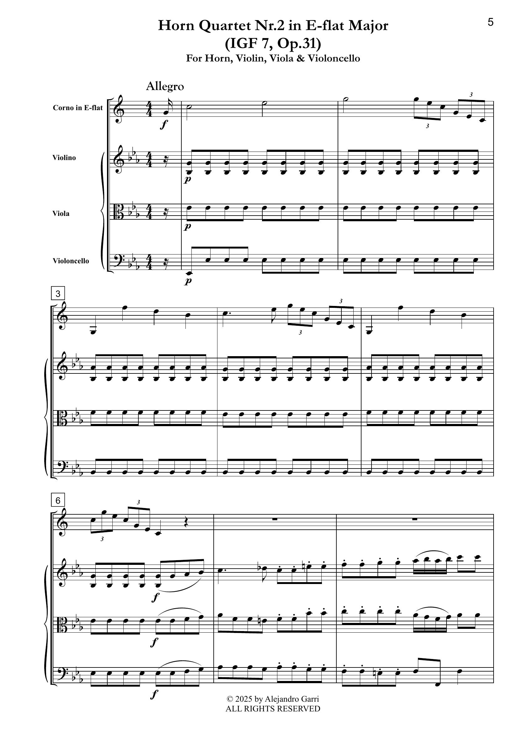Fuchs , Georg Friedrich (1752 – 1821) Horn Quartet Nr. 2 in E-flat Major (IGF 7, Op.31), for Horn, Violin, Viola & Violoncello (full score & 4 parts)