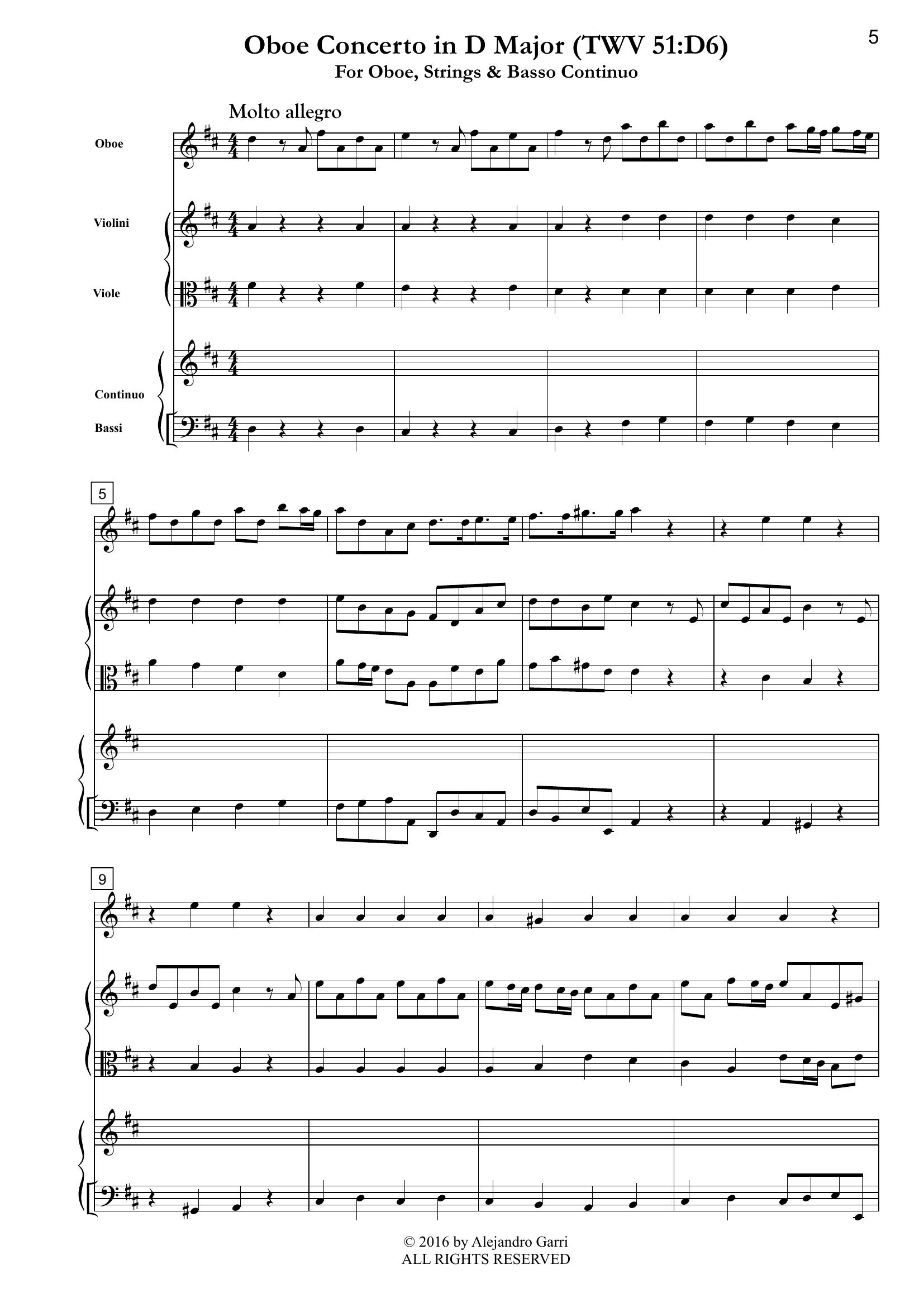 Telemann, Georg Ph. (1681-1767) Oboe Concerto in D Major (TWV 51:D6), for Oboe, Strings & Basso Continuo (Full Score & 4 Parts)