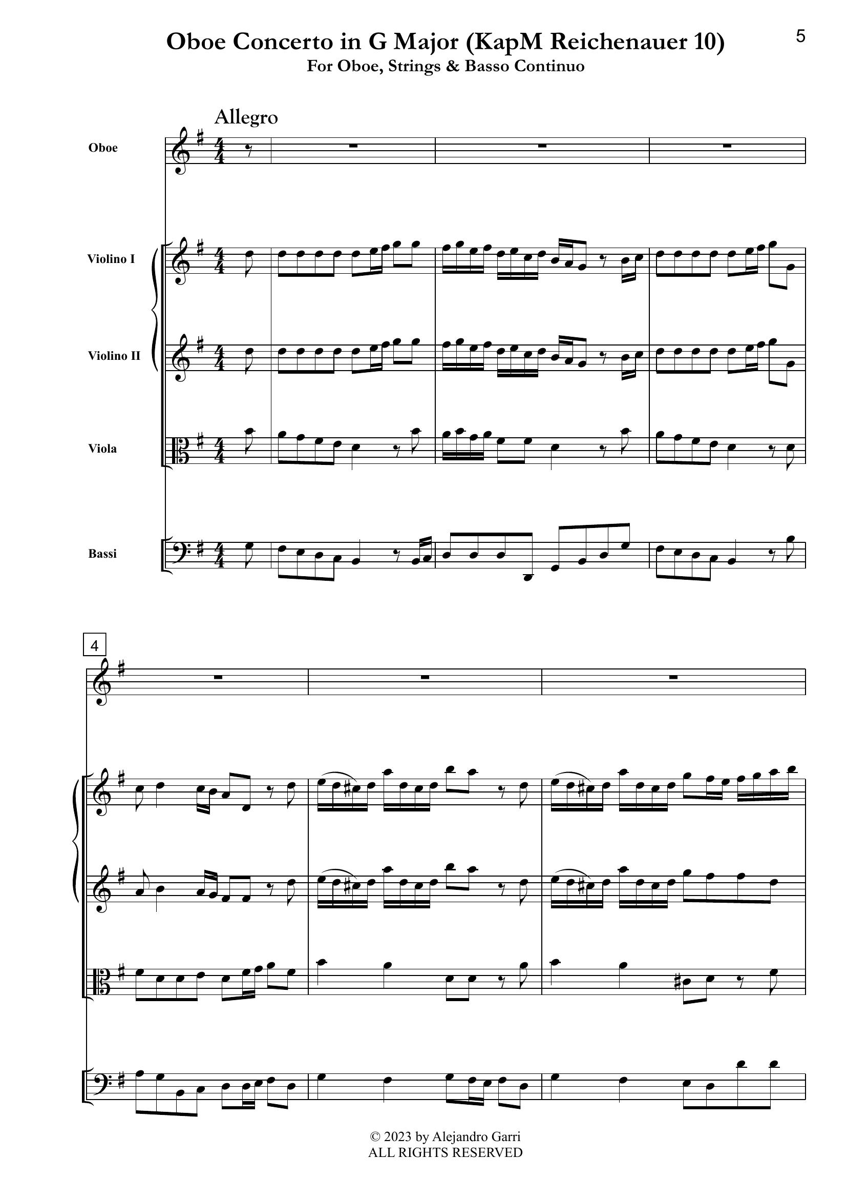 Reichenauer, Antonín (aka. Johann Anton Reichenauer, c.1694 – 1730) Oboe Concerto in G Major (KapM Reichenauer 9), for Oboe, Strings & Basso Continuo (full score & 5 parts)