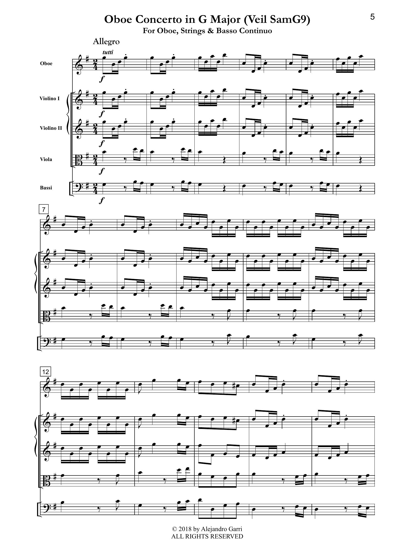 Sammartini, Giuseppe (1695 – 1750) Oboe Concerto in G Major (VeiI SamG9), for Oboe, Strings & Basso Continuo (full score & 5 parts)