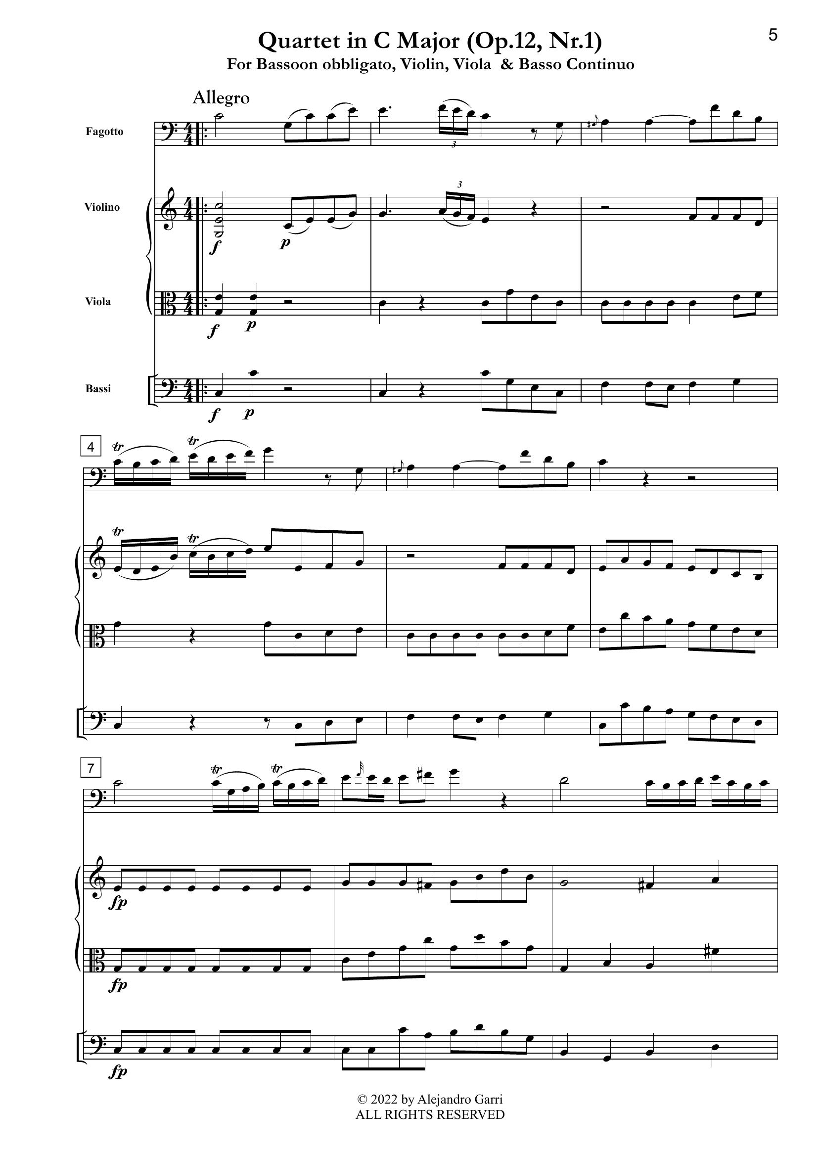 Eichner, Ernst (1740 – 1777) Quartet in C Major (Op.12, Nr.1), for Bassoon obbligato, Violin, Viola & Basso Continuo (full Score & 4 Parts)