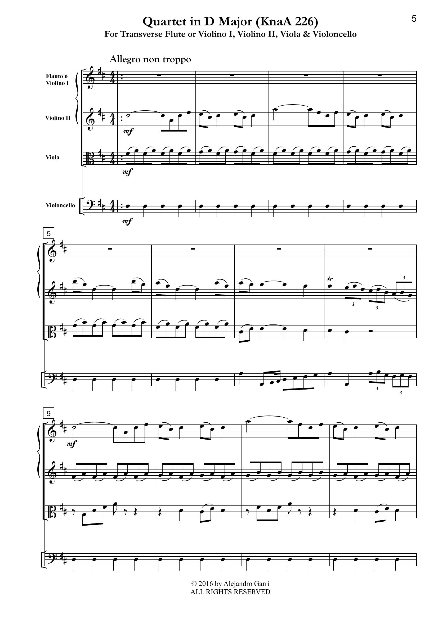 Abel, Carl Friedrich (1723 – 1787) Quartet in D Major, (KnaA 226), for Transverse Flute or Violin I, Violino II, Viola& Violoncello (full score & 4 parts)