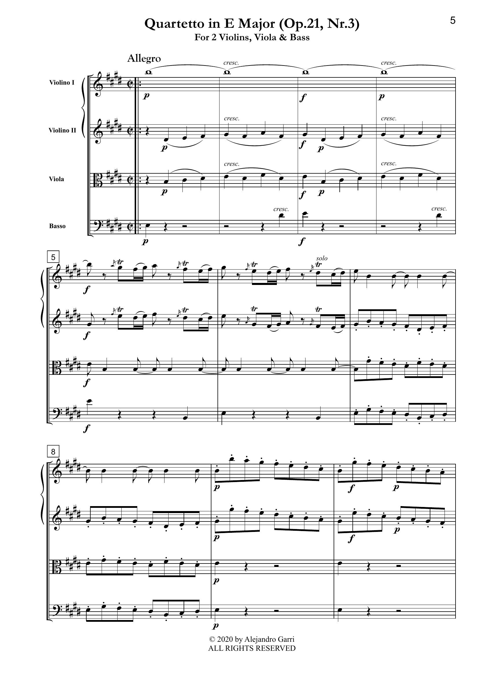 Vanhal, Johann Baptist (1739 – 1813) Quartetto in E Major (Op.21, Nr.3), for 2 Violins, Viola & Bass (full score & 4 parts)