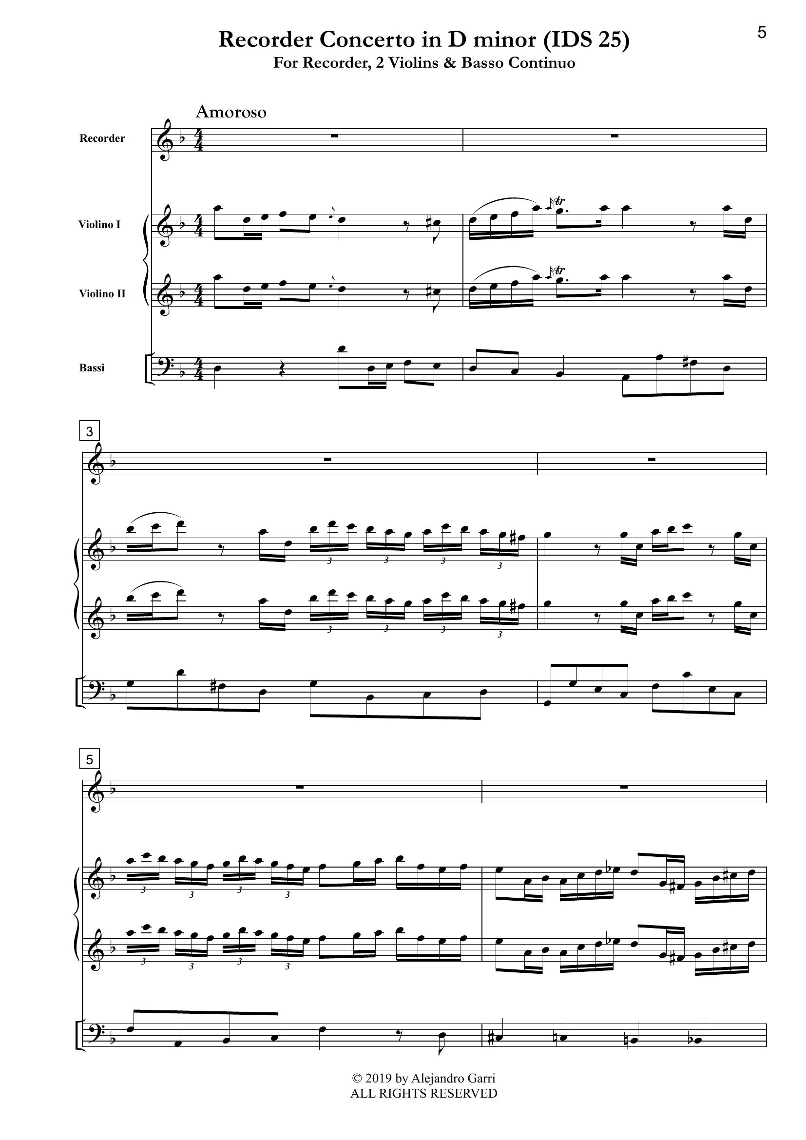 Sarro, Domenico (1679 – 1744) Recorder Concerto in D minor (IDS 25), for Recorder, 2 Violins & Basso Continuo (full score & 4 parts)