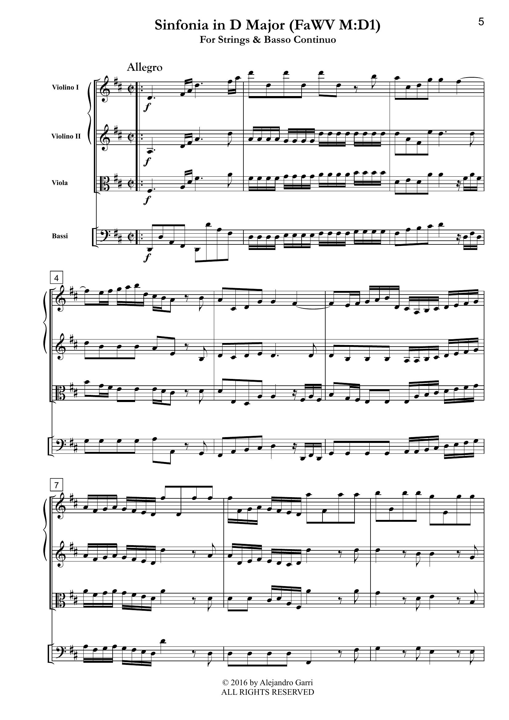 Fasch, Johann Fr. (1688-1758) Sinfonia in D Major (FaWV M:D1), for Strings & Basso Continuo (full score & 4 parts)