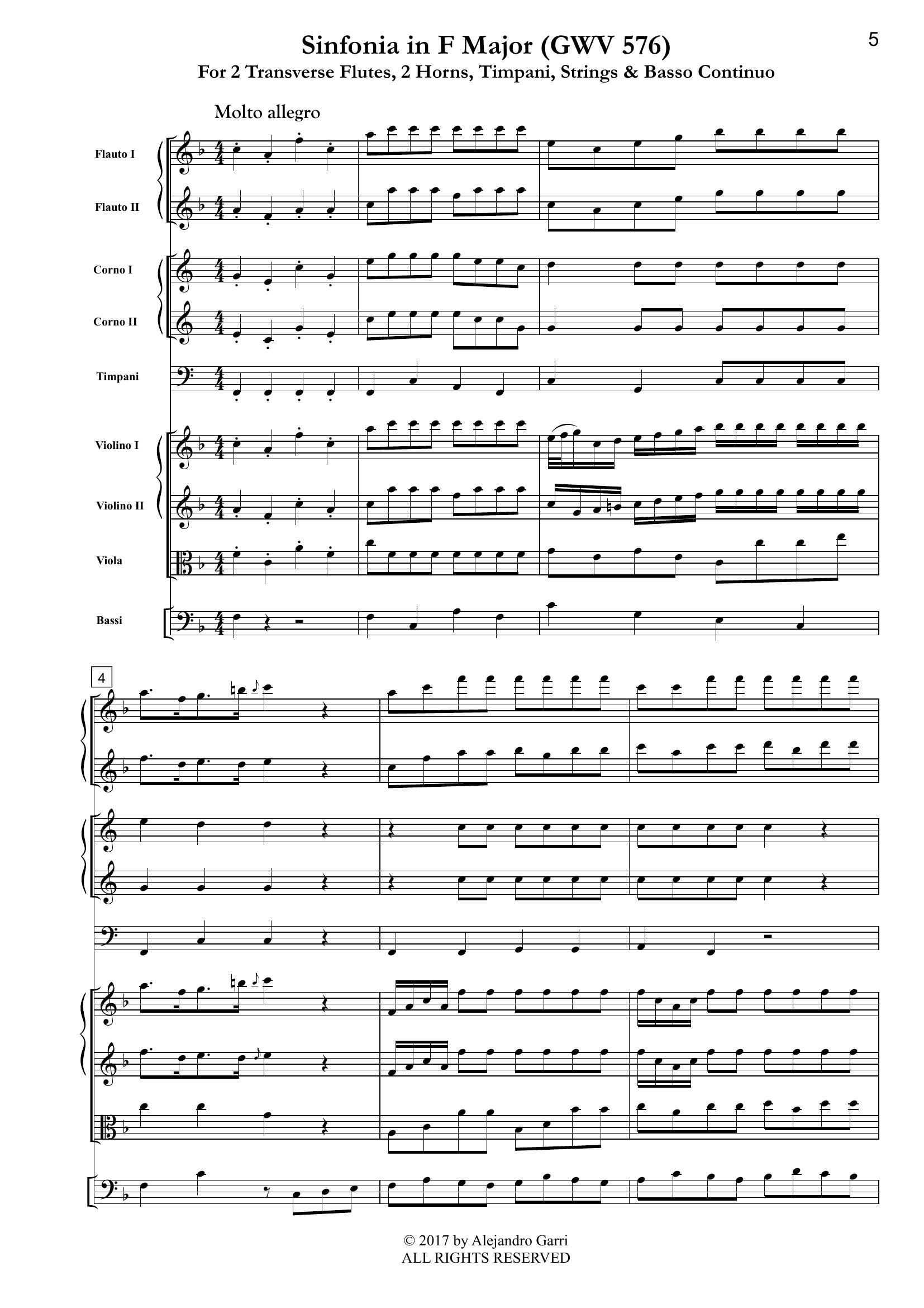 Graupner, Christoph (1683 – 1760) Sinfonia in F Major (GWV 576), for 2 Transverse Flutes, 2 Horns, Timpani, Strings & Basso Continuo (full score)