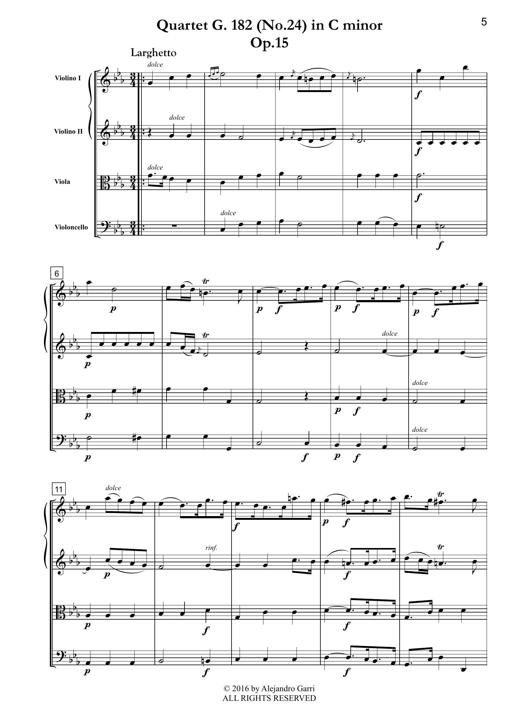 Boccherini, Luigi (1743 – 1805) Six String Quartets, Op.15 (G. 177 – 182), for 2 Violins, Viola & Violoncello, Volume 6 (full score & 4 parts)