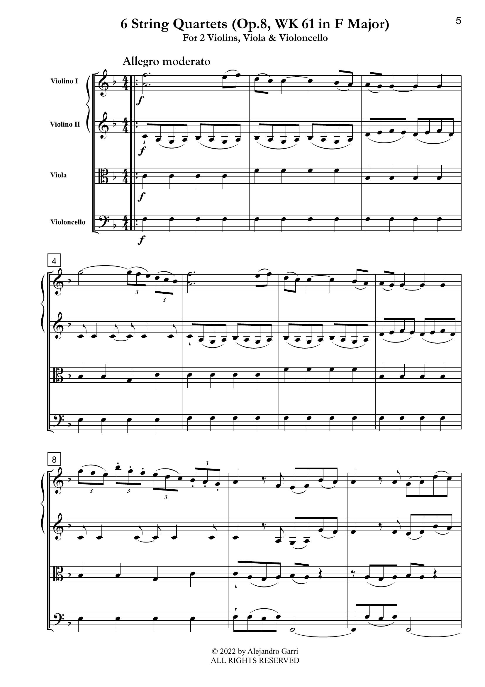 Abel, Carl Friedrich (1723 – 1787) Six String Quartets (Op.8, WK 61 in F Major), for 2 Violins, Viola & Violoncello (full score & 4 parts)