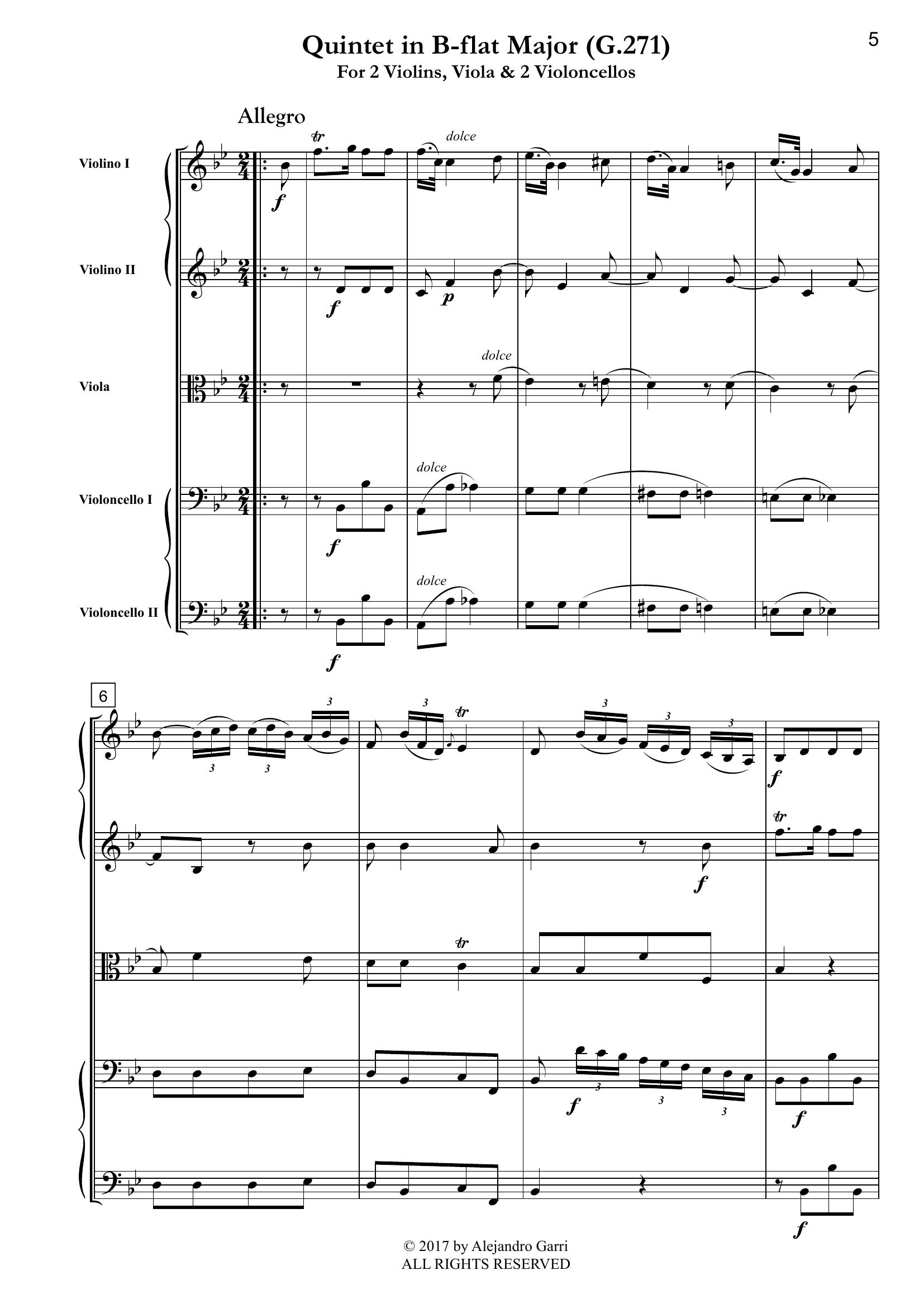 Boccherini, Luigi (1743 – 1805) Six String Quintets, Op.11, Volume 1, Quintet in B-flat Major (G.271), for 2 Violins, Viola & 2 Violoncellos (full score)
