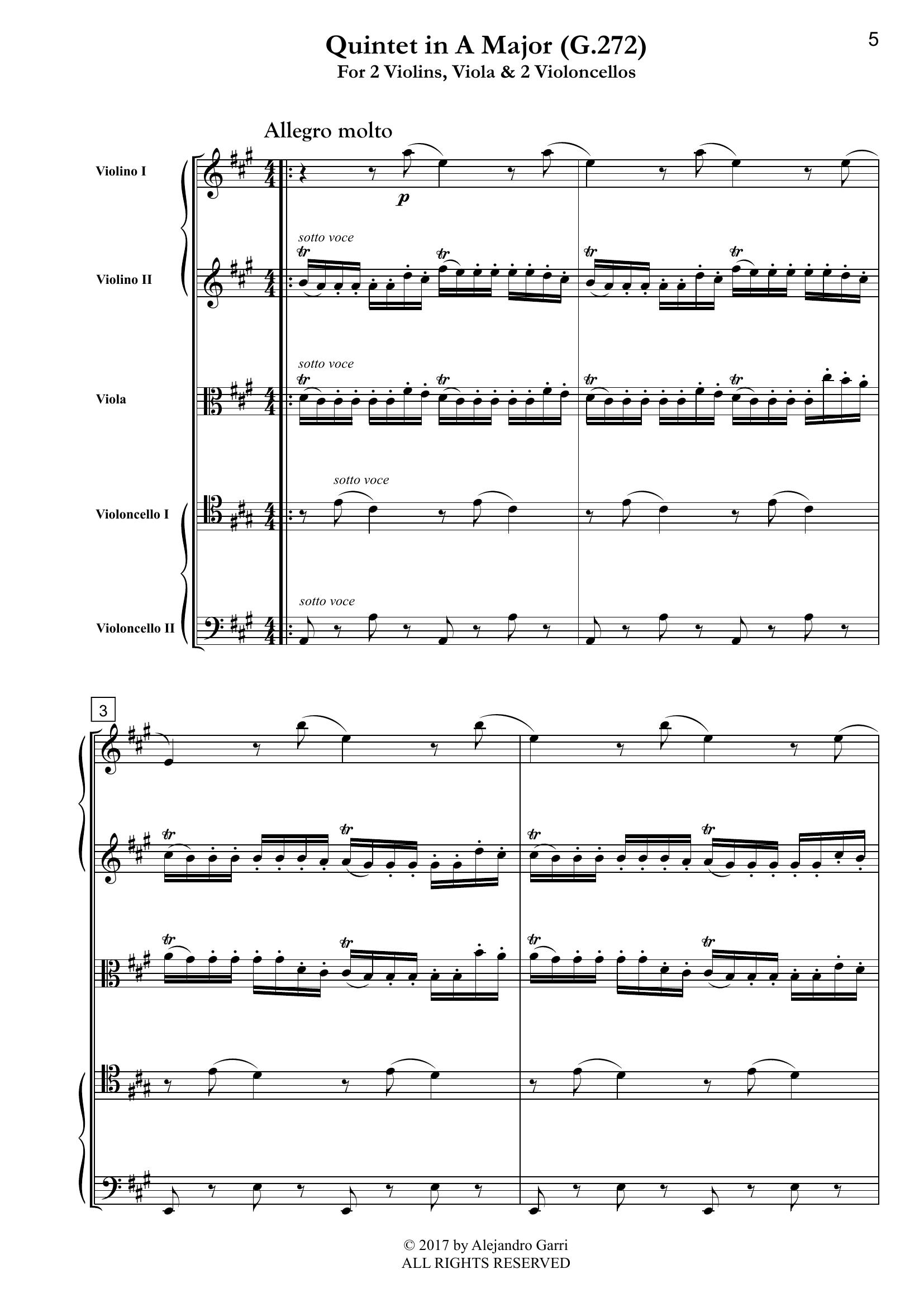 Boccherini, Luigi (1743 – 1805) Six String Quintets, Op.11, Volume 2: G.272, for 2 Violins, Viola & 2 Violoncellos (full score)