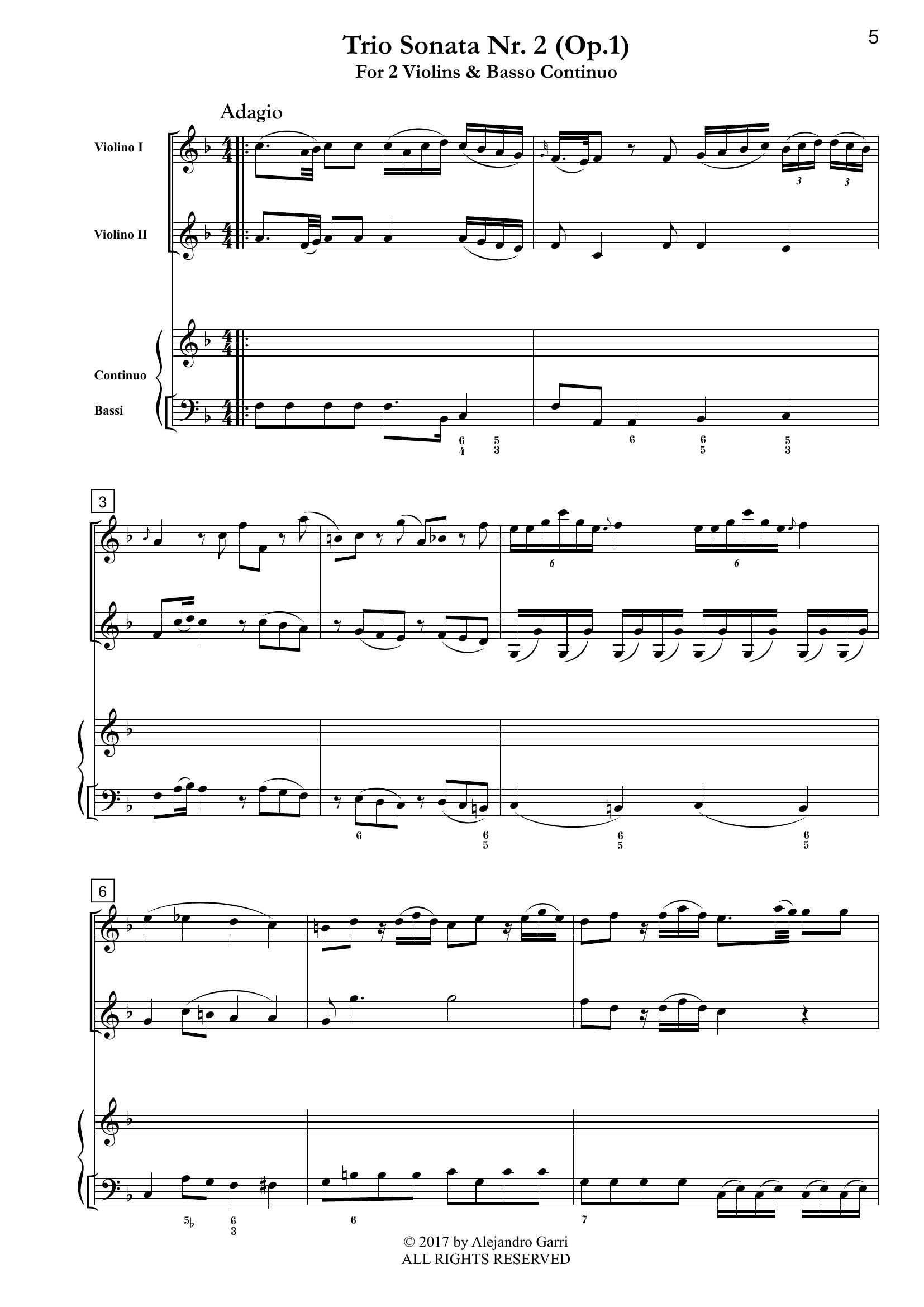 Pugnani, Gaetano (1731 – 1798) Six Trio Sonatas, Op.1, Nr.2, for 2 Violins & Basso Continuo (full score & 3 parts)