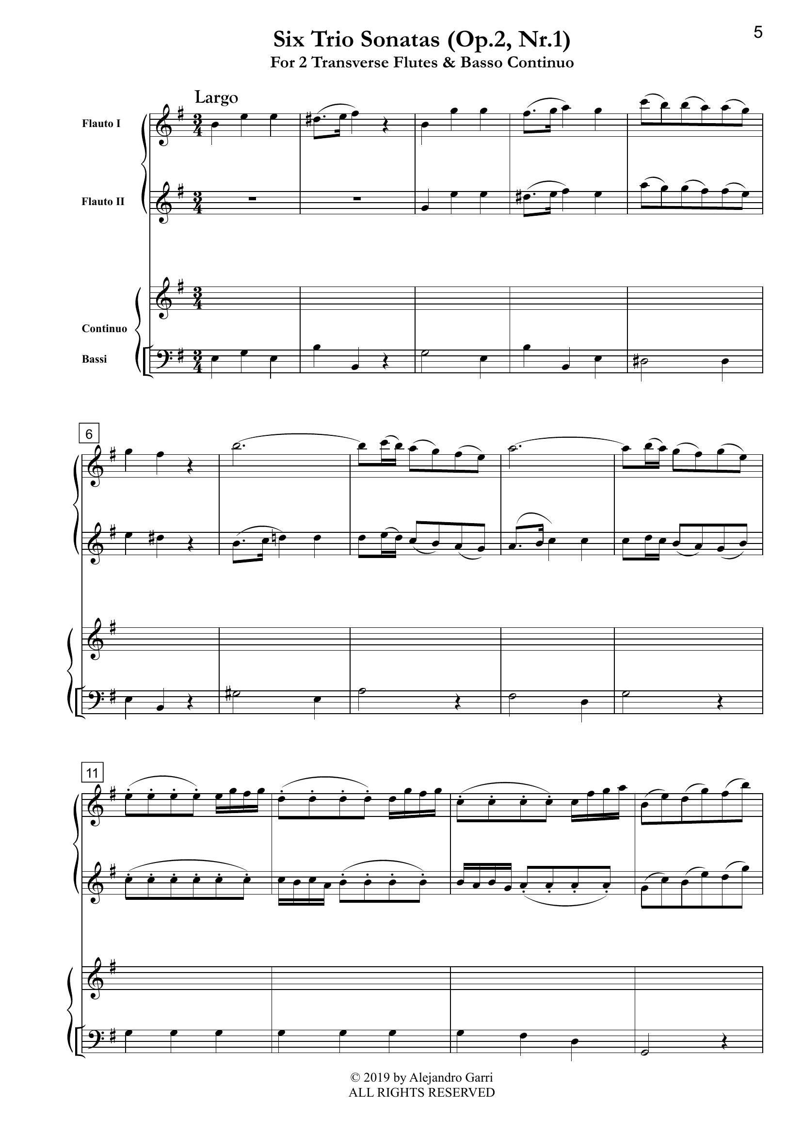 Hasse, Johann A. (1699 – 1783) Six Trio Sonatas (Op.2, Nr.1), for 2 Transverse Flutes & Basso Continuo (full score & 3 parts)