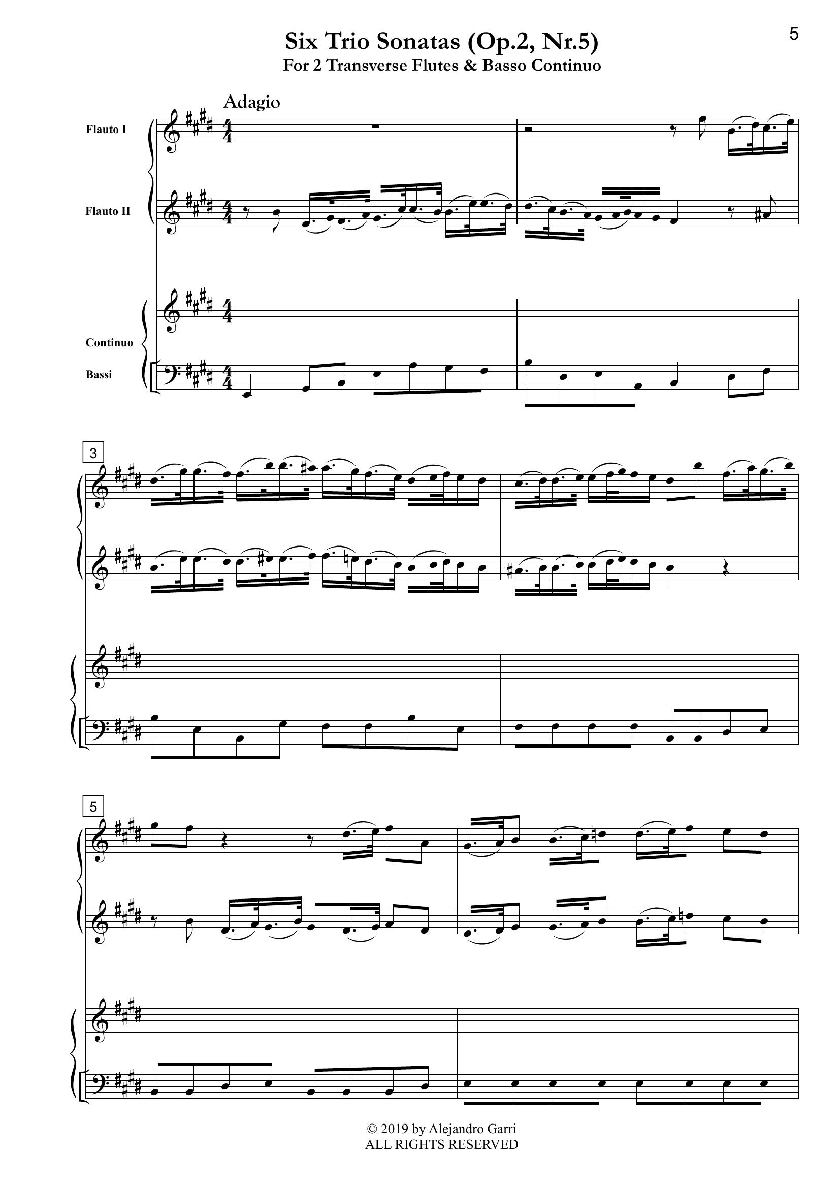 Hasse, Johann A. (1699 – 1783) Six Trio Sonatas (Op.2, Nr.5), for 2 Transverse Flutes & Basso Continuo (full score & 3 parts)
