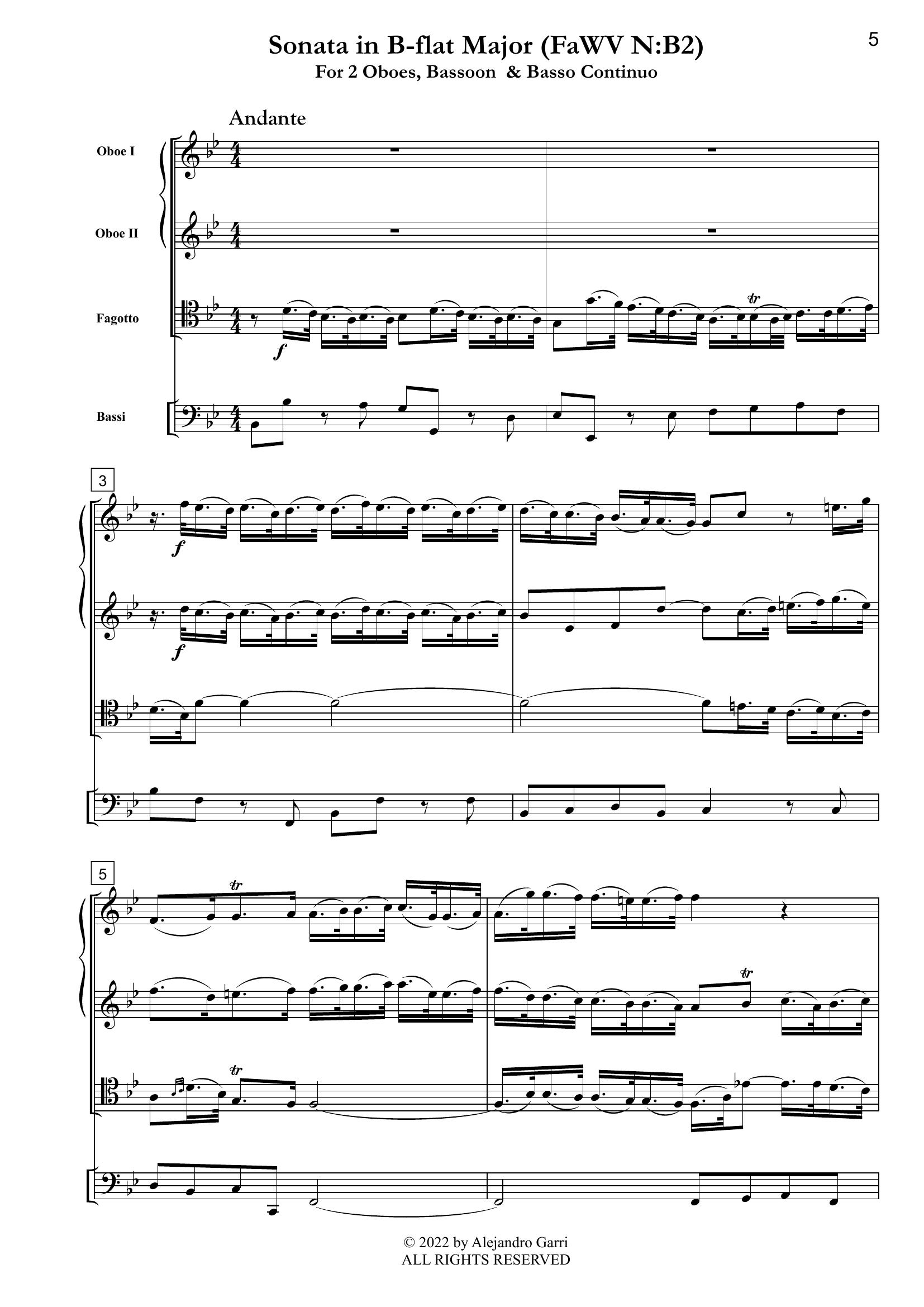 Fasch, Johann Fr. (1688 – 1758) Sonata in B-flat Major (FaWV N:B2), for 2 Oboes, Bassoon & Basso Continuo (full score & 4 parts)