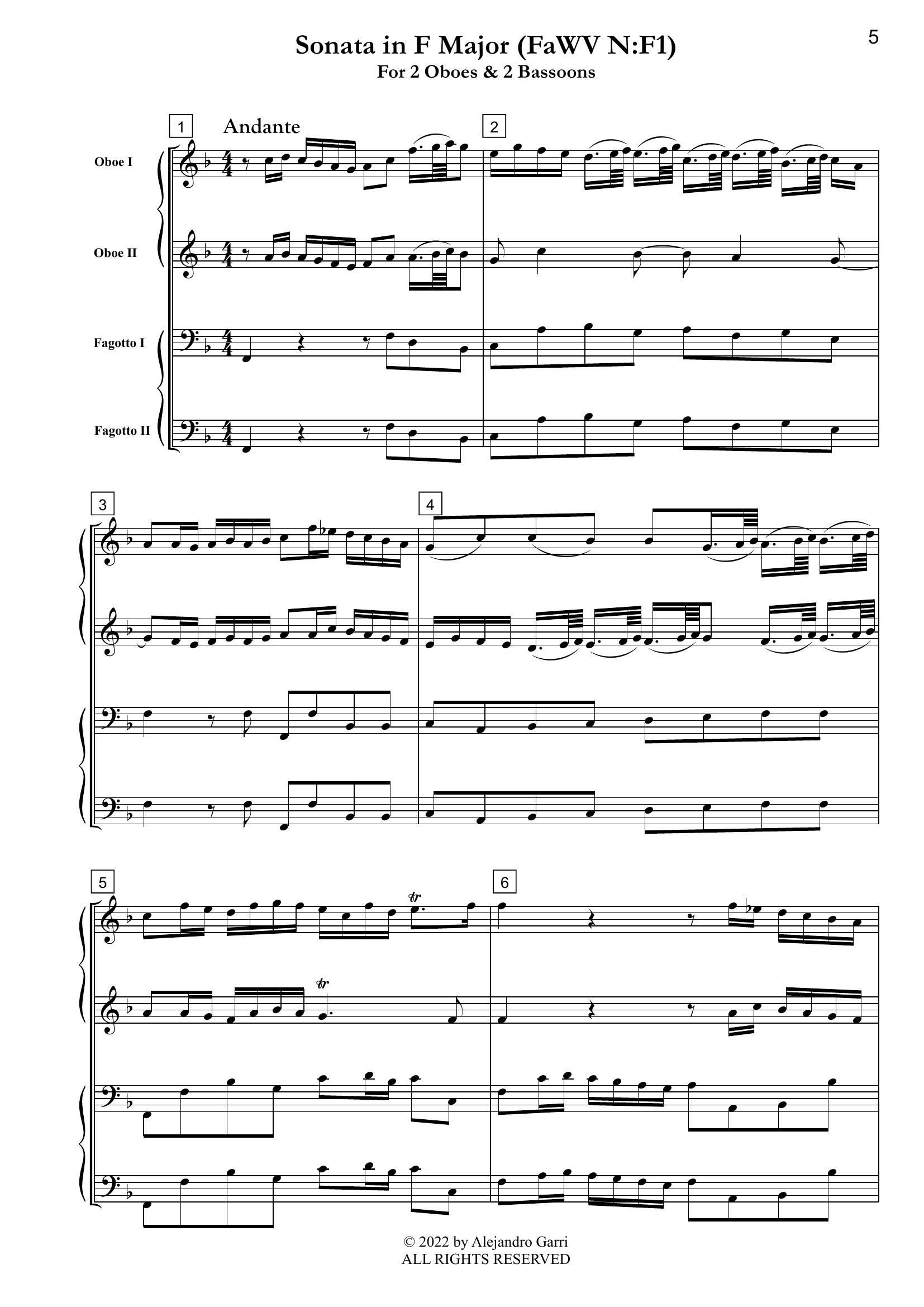 Fasch, Johann Fr. (1688-1758) Sonata in F Major (FaWV N:F1), for 2 Oboes & 2 Bassoons (full score & 4 parts)