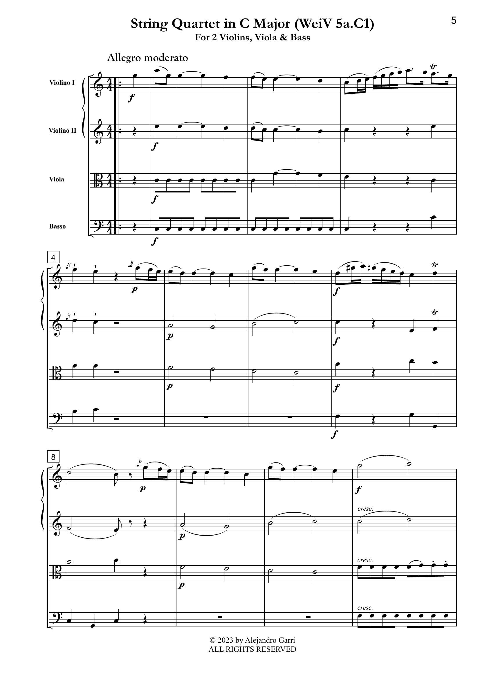 Vanhal , Johann Baptist (1739 – 1813) String Quartet in C Major (WeiV 5a. C1), for 2 Violins, Viola & Bass (full score & 4 parts)