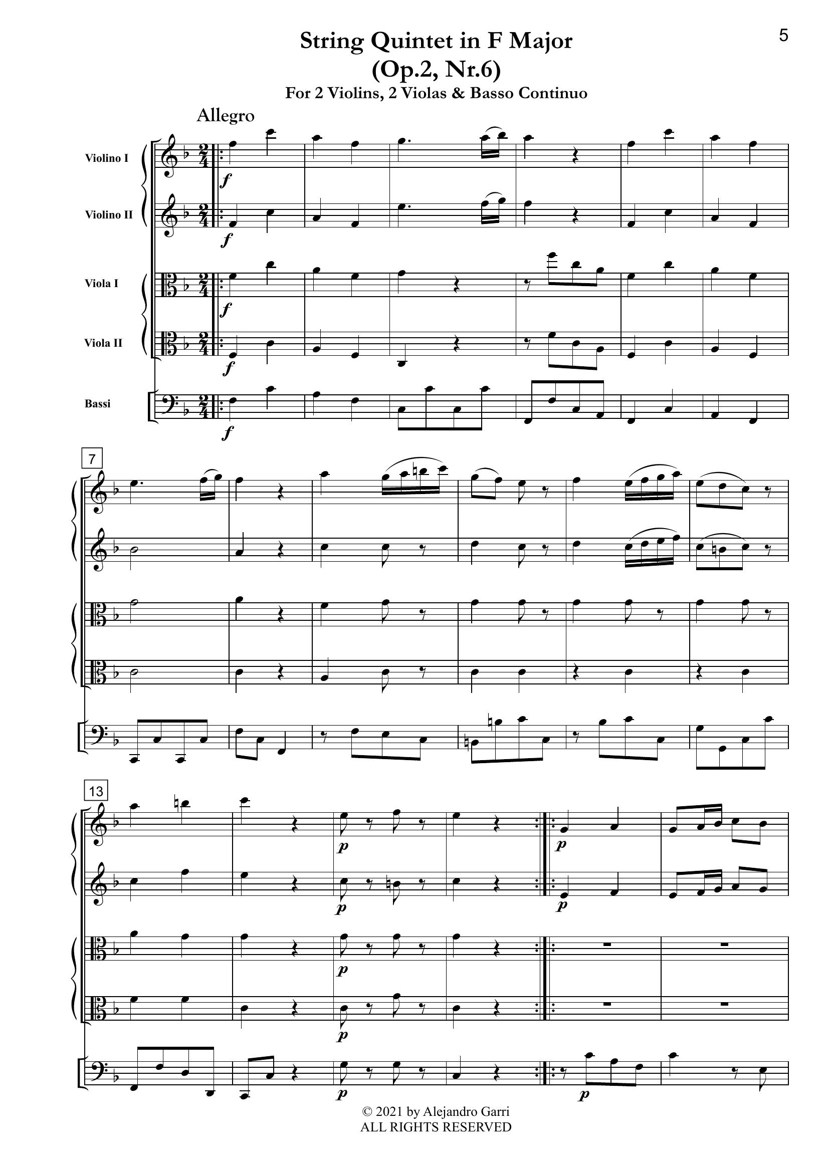 Gassmann, Florian Leopold (1729 – 1774) String Quintet in F Major, (Op.2, Nr.6), for 2 Violins, 2 Violas & Basso Continuo (full score & 5 parts)
