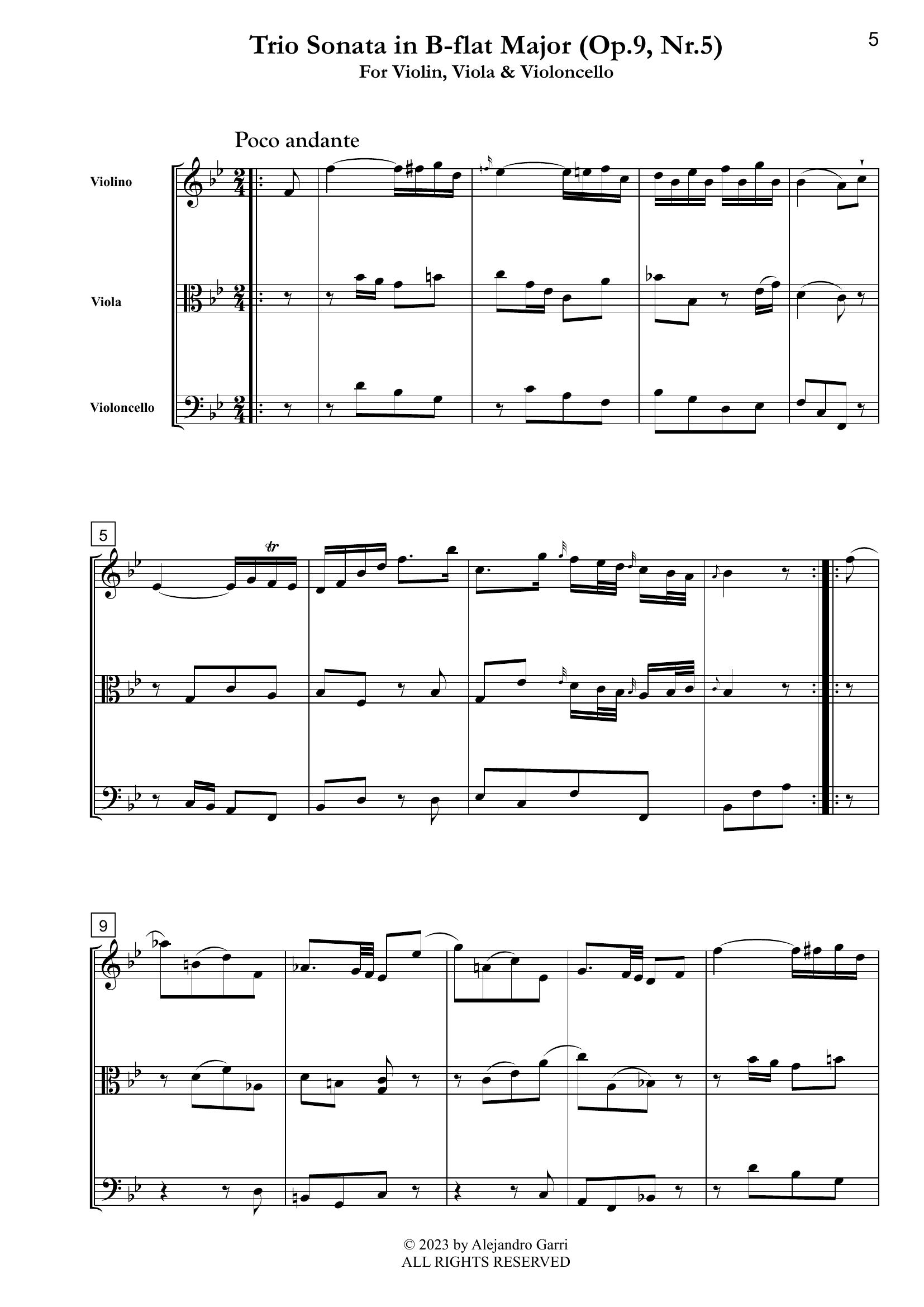 Albrechtsberger, Johann Georg (1736 –1809) Trio Sonata in B-flat Major (Op.9, Nr.5), for Violin, Viola & Violoncello (full score & 3 parts)