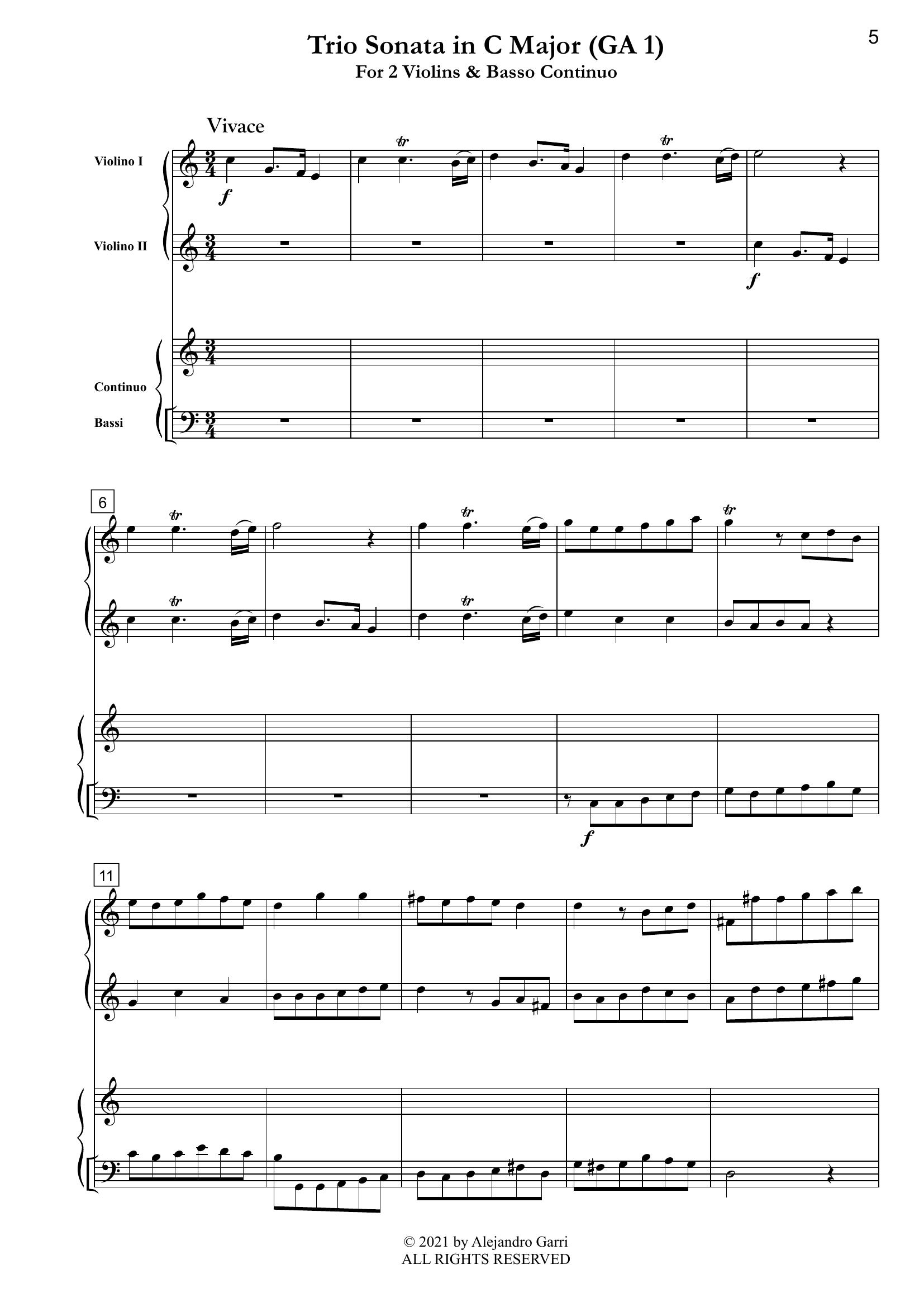 Leo, Leonardo (1694 – 1744) Trio Sonata in C Major (Ga 1), for 2 Violins & Basso Continuo (full score & 3 parts)
