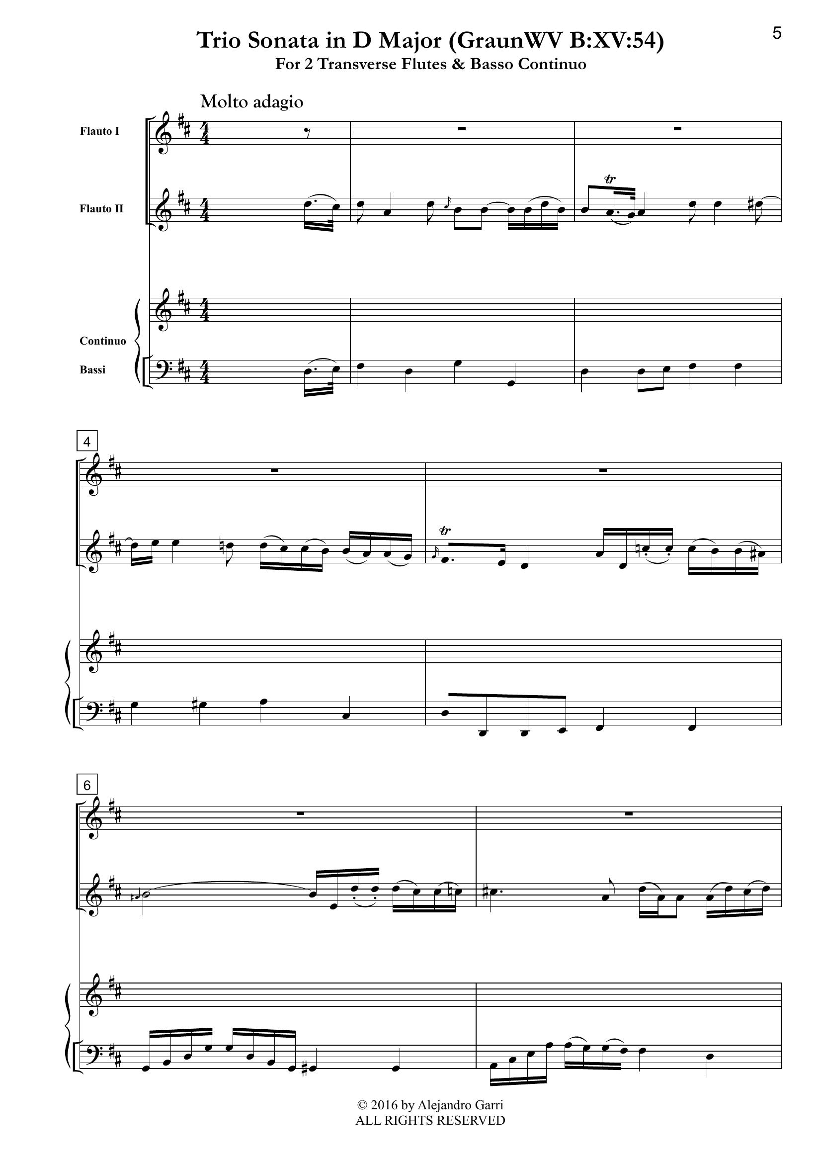 Graun, Carl Heinrich (ca.1703 -1759) Trio Sonata in D Major (GraunWV B:XV:54), for 2 Transverse Flutes & Basso Continuo (full score & 3 parts)