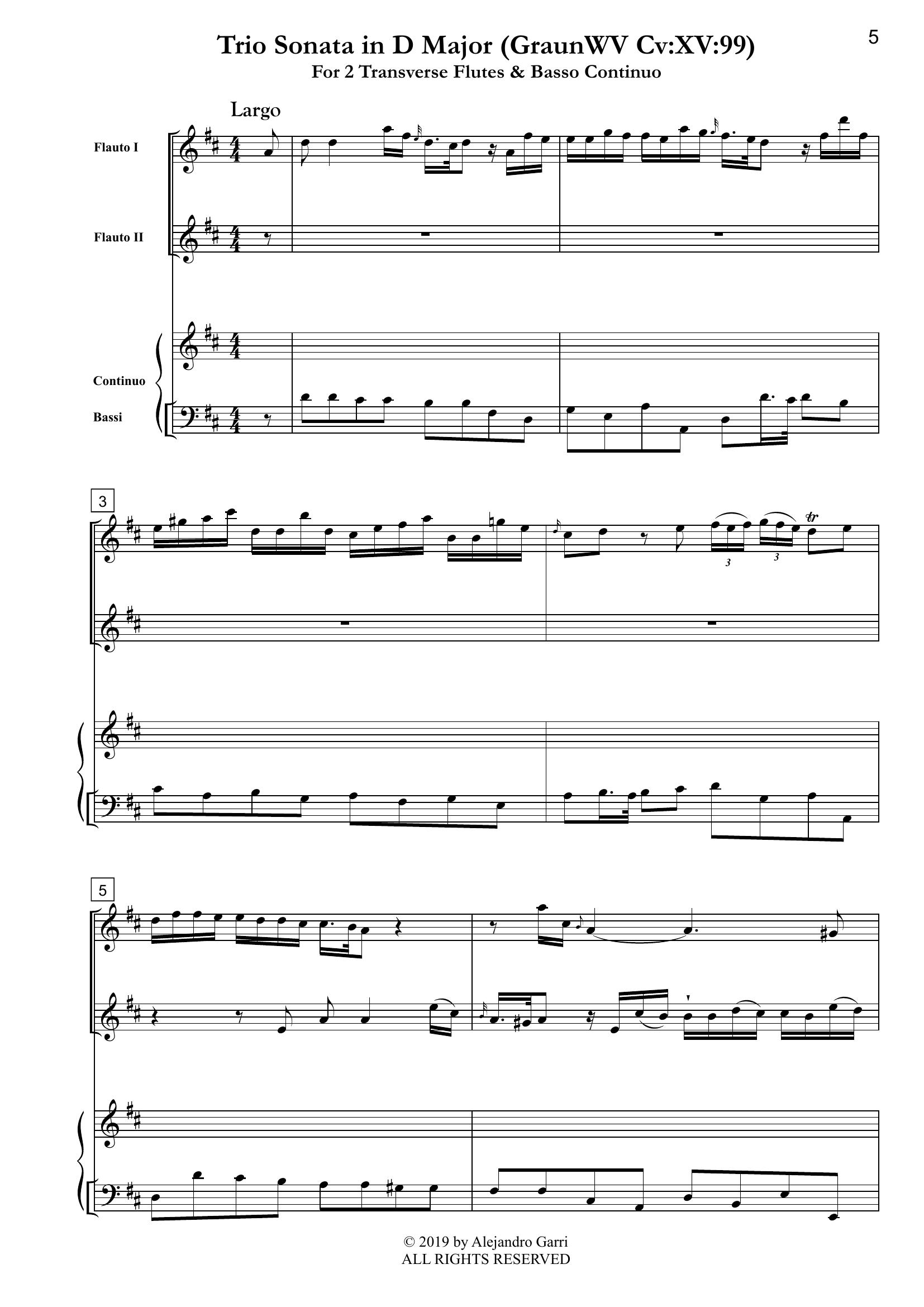Graun, Johann Gottlieb (1702/03 – 1771) Trio Sonata in D Major (GraunWV Cv:XV:99), for 2 Transverse Flutes & Basso Continuo (full score & 3 parts)