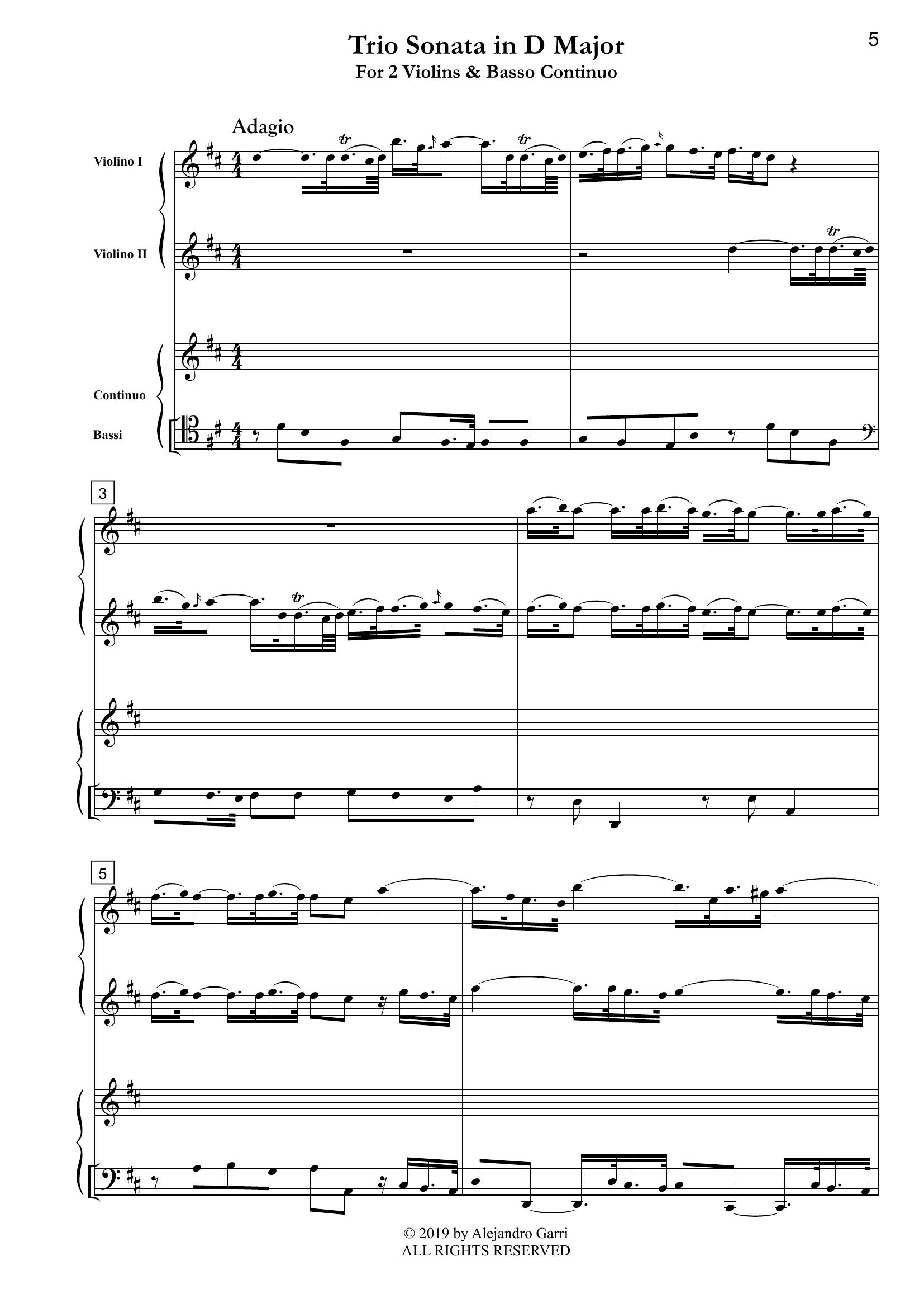 Leo, Leonardo (1694 – 1744) Trio Sonata in D Major (I-Cat. Nr. ILL 70), for 2 Violins & Basso Continuo (full score & 3 parts)