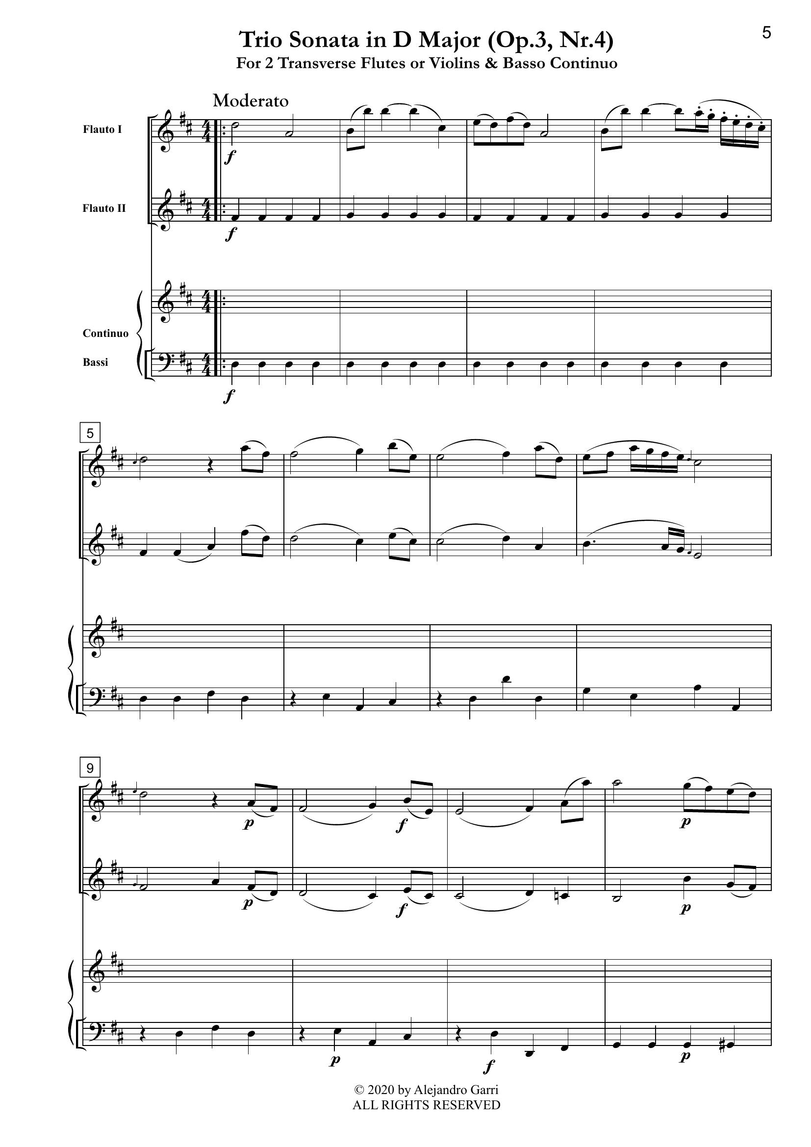 Abel, Carl Friedrich (1723 – 1787) Trio Sonata in D Major (Op.3, Nr.4), for 2 Transverse Flutes or Violins & Basso Continuo (full score & 3 parts)