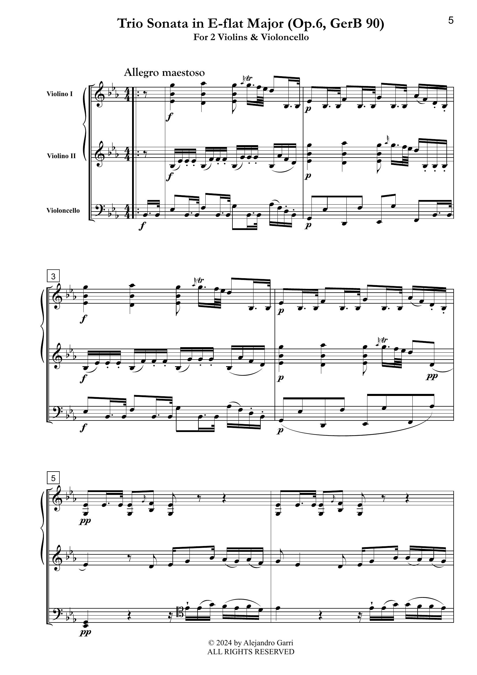Boccherini, Luigi (1743 – 1805) Trio Sonata in E-flat Major (Op.6, GerB 90), for 2 Violins & Violoncello (full score & 3 parts)