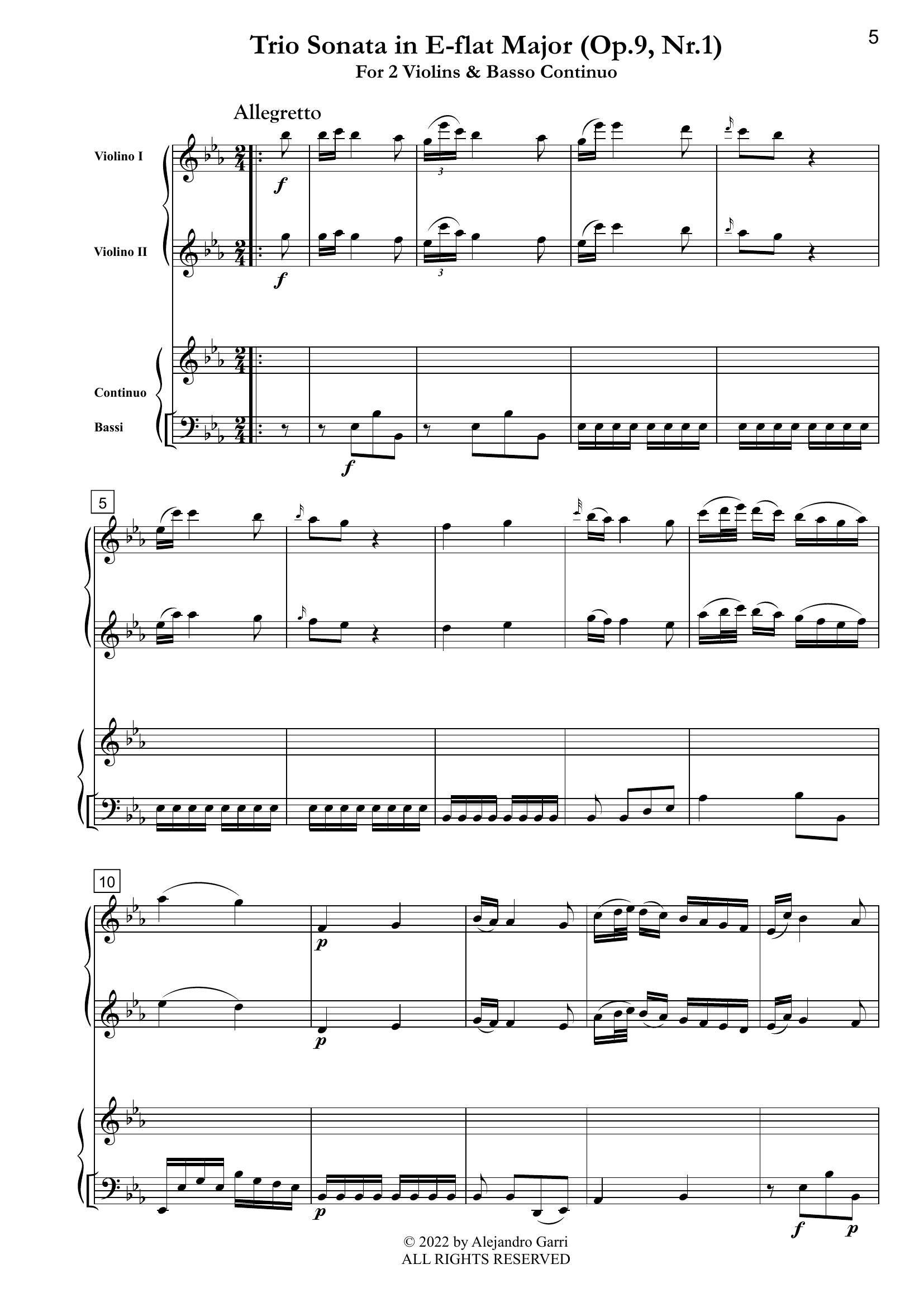 Pugnani, Gaetano (1731 – 1798) Trio Sonata in E-flat Major (Op.9, Nr.1), for 2 Violins & Basso Continuo (full score & 3 parts)