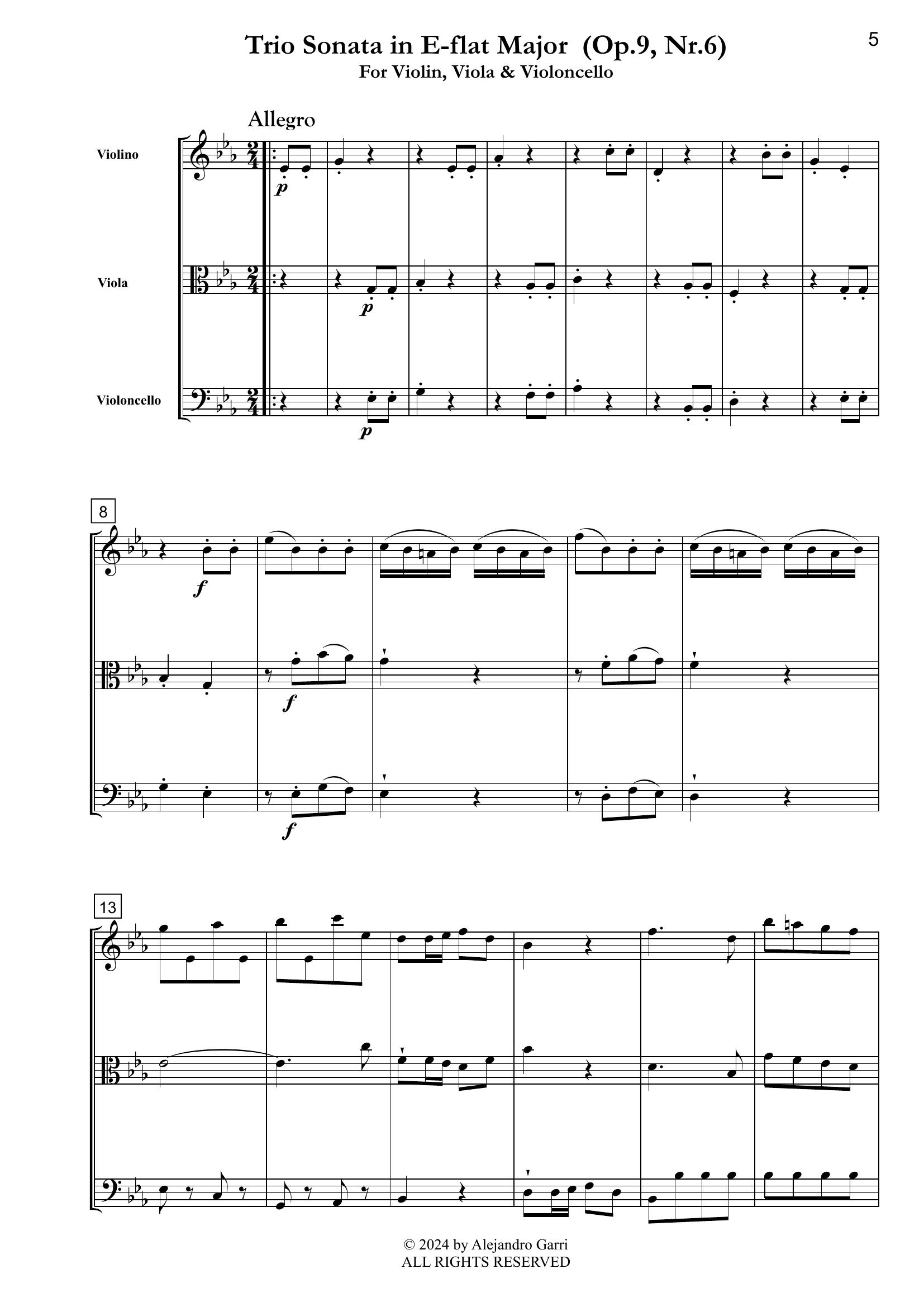 Albrechtsberger, Johann Georg (1736 –1809) Trio Sonata in E-flat Major (Op.9, Nr.6), for Violin, Viola & Violoncello (full score & 3 parts)