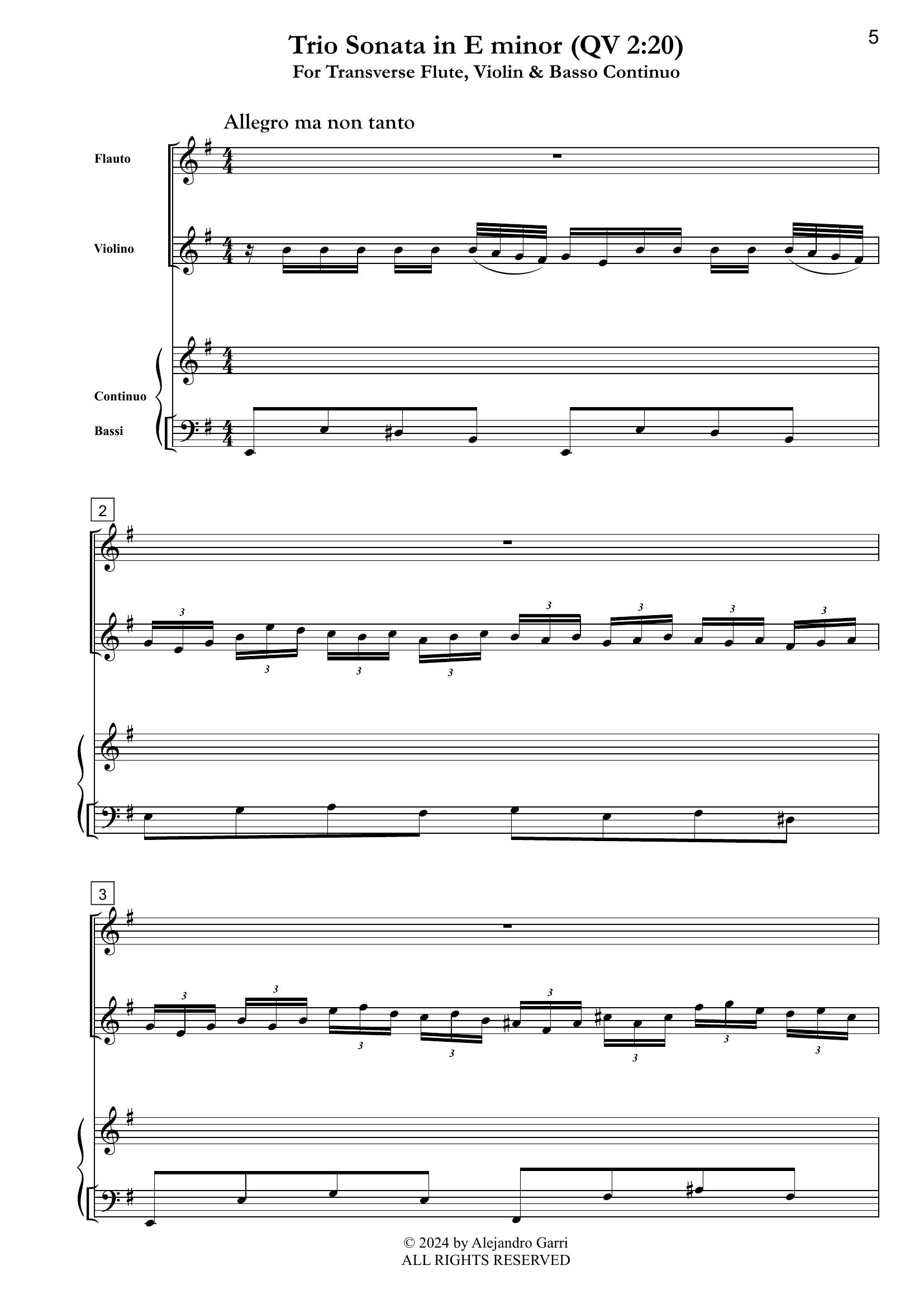 Quantz, Johann Joachim (1697 – 1773) Trio Sonata in E minor (QV 2:20), for Transverse Flute, Violin & Basso Continuo (full score & 3 parts)