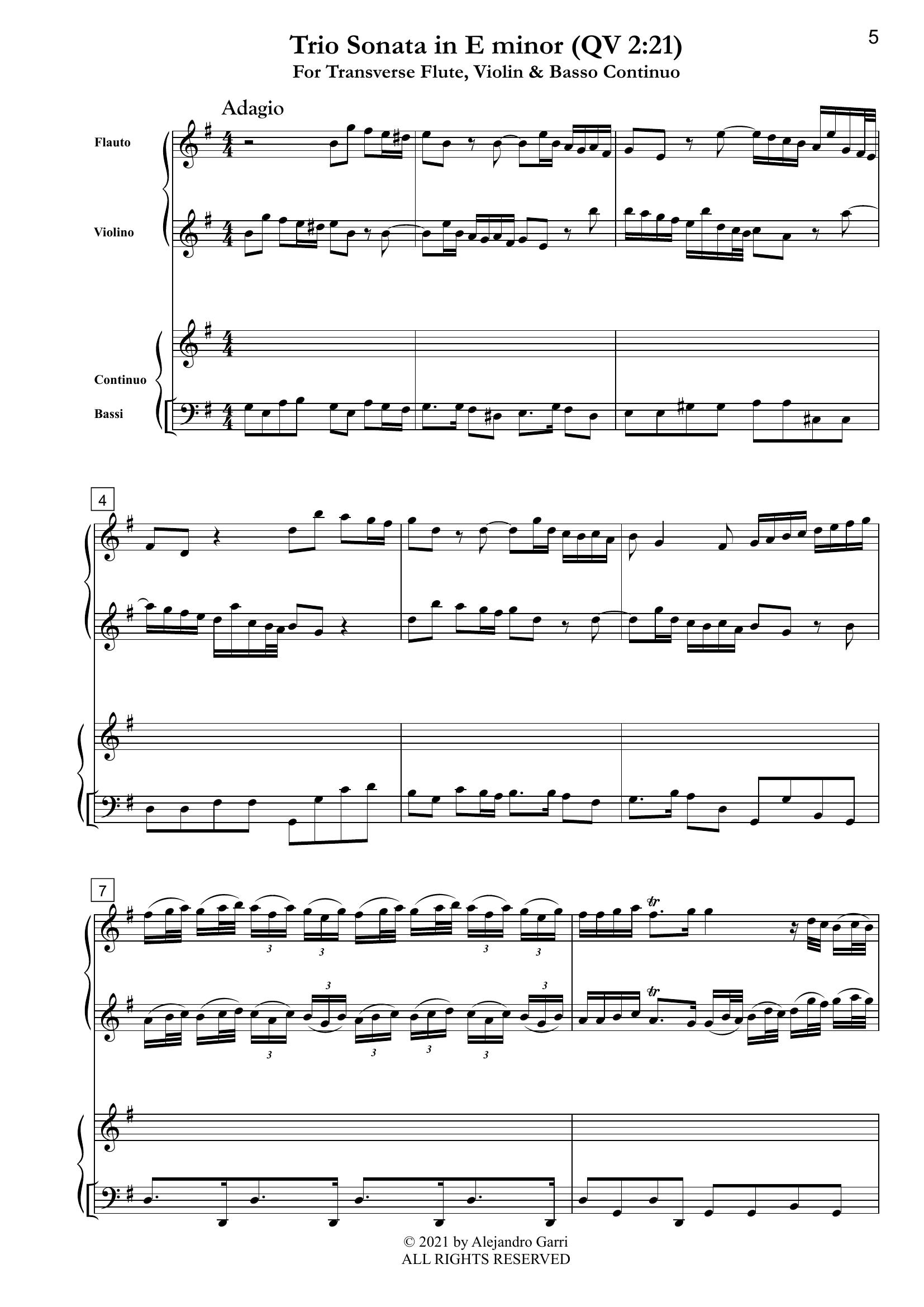 Quantz, Johann Joachim (1697 – 1773) Trio Sonata in E minor (QV 2:21), for Transverse Flute, Violin & Basso Continuo (full score & 3 parts)