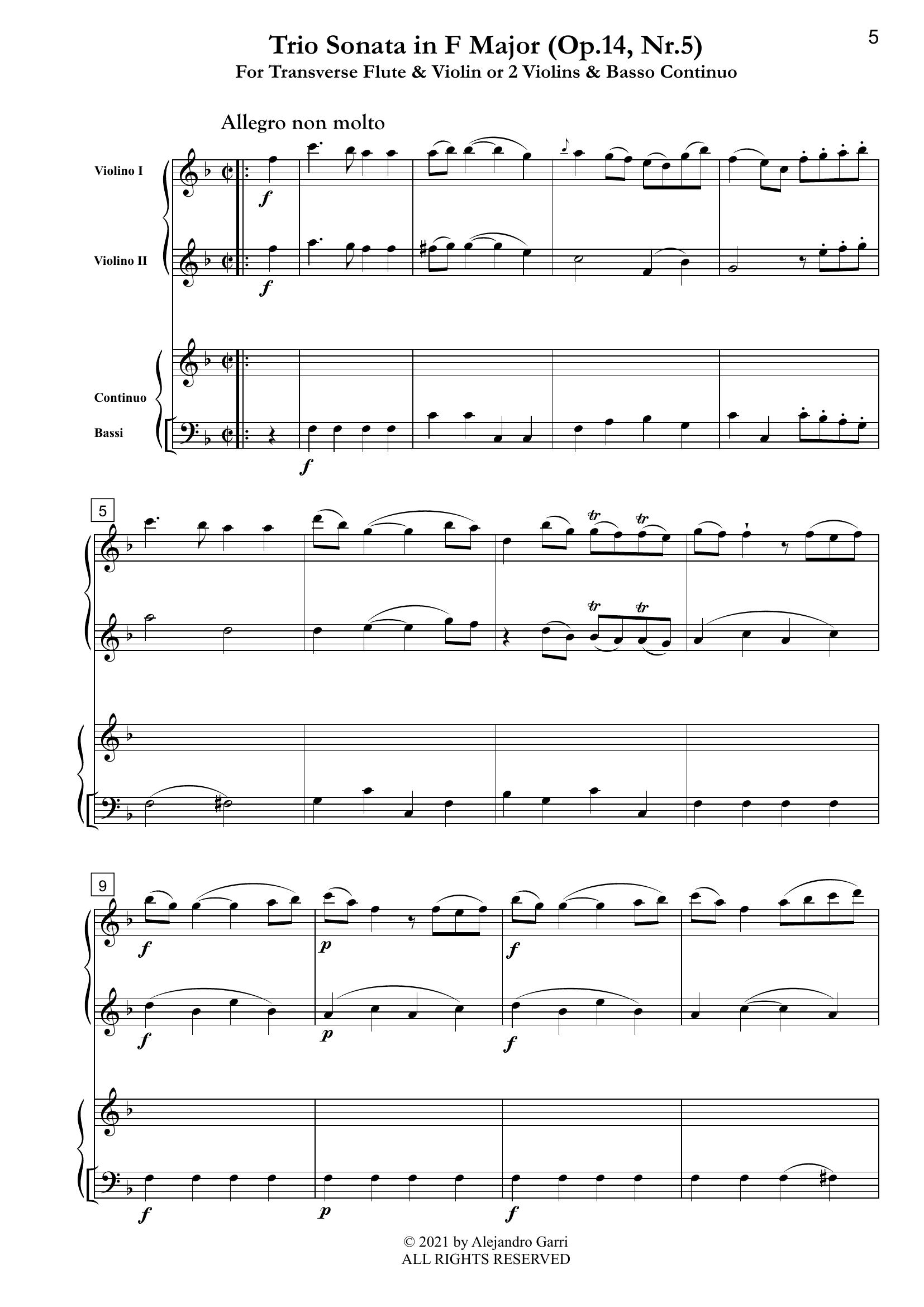 Stamitz, Carl Philipp (1745 – 1801) Trio Sonata in F Major (Op.14, Nr.5), for Transverse Flute and Violin or 2 Violins and Basso Continuo (full score & 3 parts)